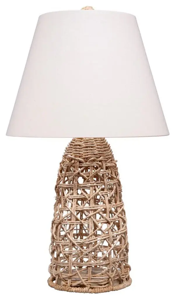 Inspired by a warm, Hawaiian summer breeze, this table lamp will add a relaxed yet elevated atmosphere to your home. The alternating woven pattern adds interest to the body''s rounded cone-like shape, with a matching corn rope finial topping a white linen shade. Expertly handcrafted of natural material, the crisscrossed openwork weaving adds texture and fresh style to any setting. The tapered shade is white linen fabric.19.5"L x 19.5"W x 32"H. Weighs 6.2 lbs.Hand Finished Natural Corn Rope. Linen Fabric ShadeUL listed. Uses one max 60W Type A bulb (not included). 3 way socket switch.Heirloom Quality - Expertly hand crafted and hand finished. Due to the hand crafted nature of this piece, each piece may have subtle differences.
