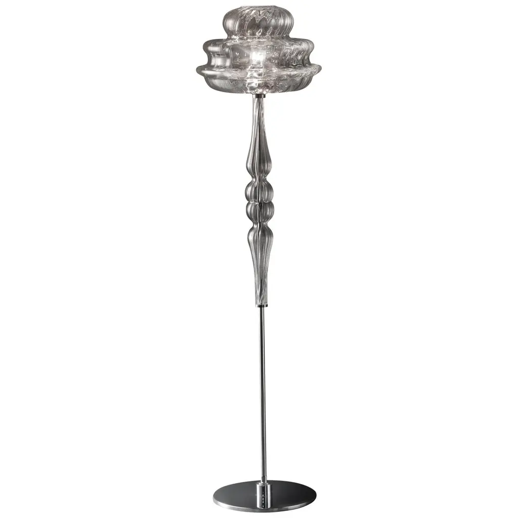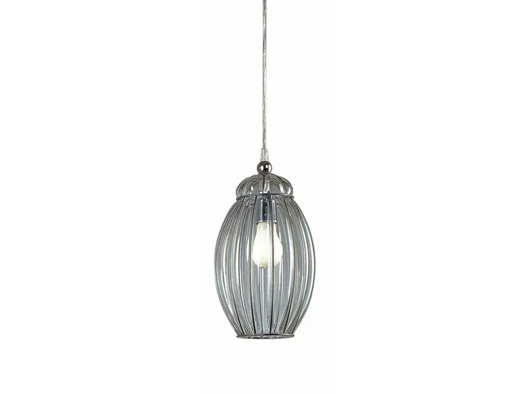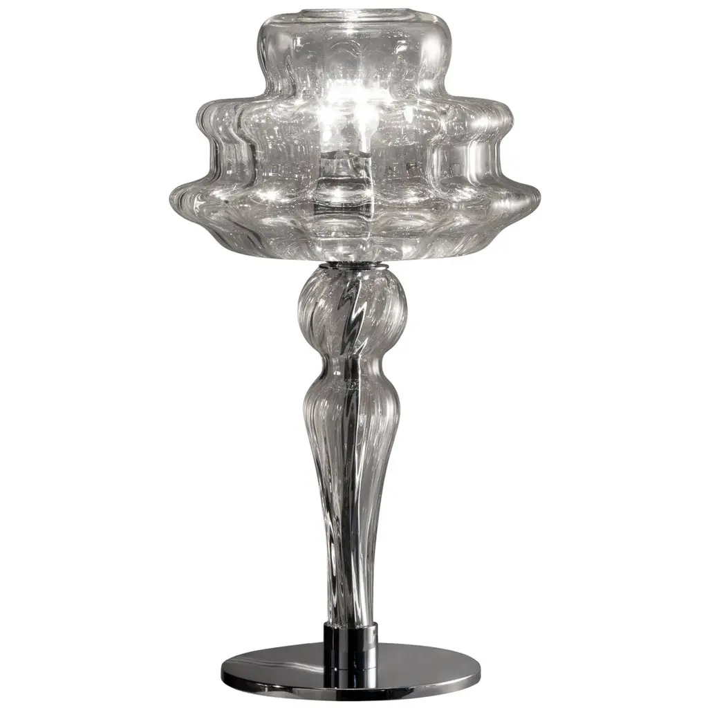 A glossy stainless steel frame distinguishes the modern look of this table lamp, comprised of a round base and of a cage whose thin, sinuous rods embrace a precious diffuser in mouth-blown Murano glass. Due to handcrafting, slight changes in metal's finish may occur.