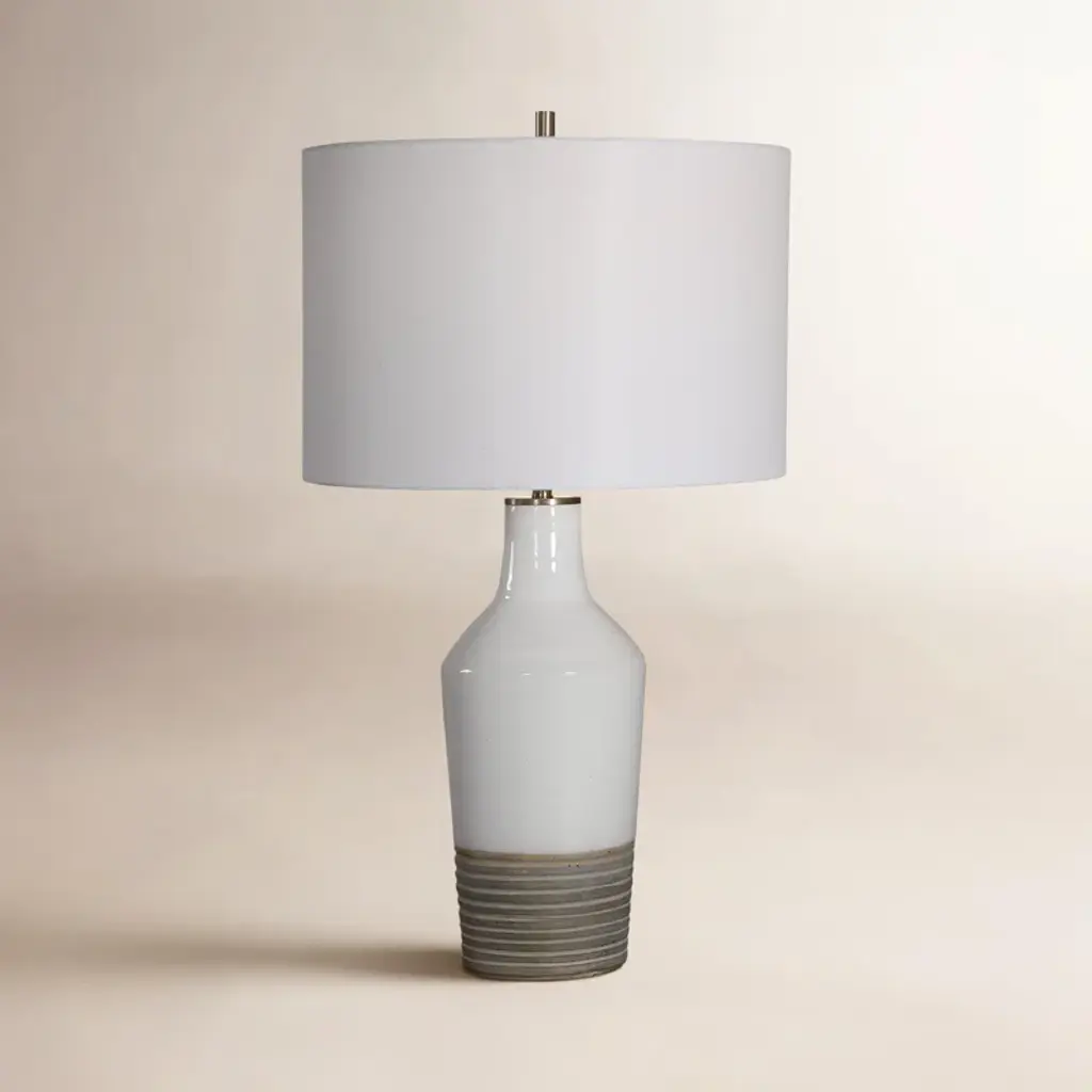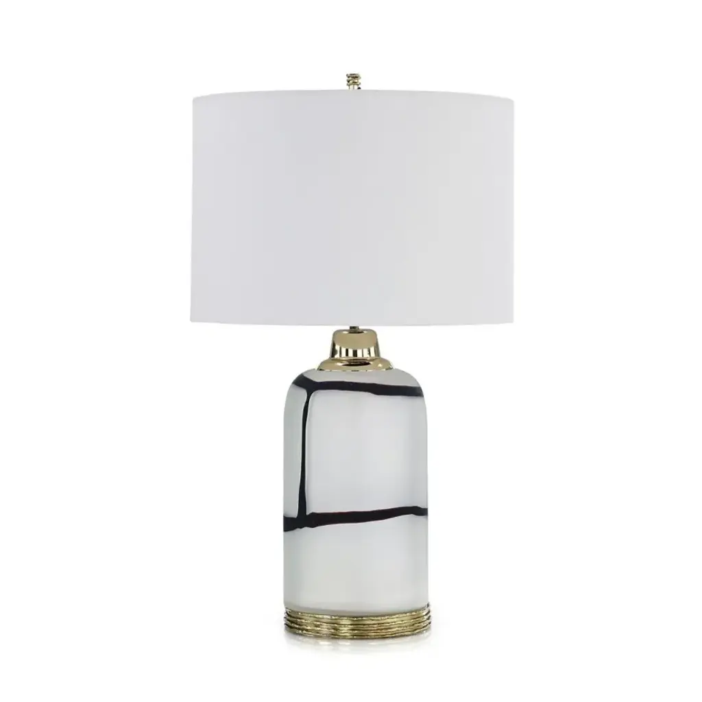 The Nazo Table Lamp is a stylish contemporary piece featuring opulent tones and abstract motifs. Crafted from art glass, the piece demonstrates a milky white tone, overlain with meandering black shapes. A smooth aluminum accent in Champagne adorns the neck, playfully contrasted by the textural grooves of the base and cylinder finial. The look is completed by a large white drum shade.
