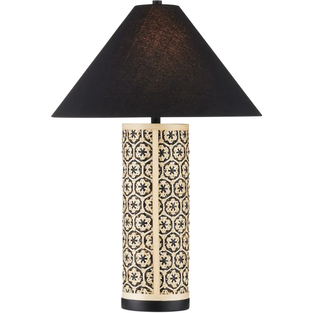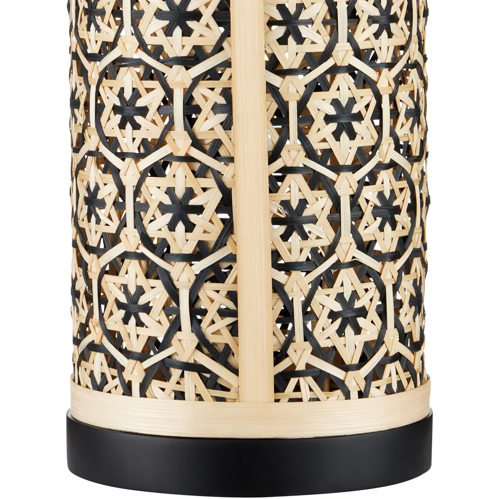 The Nebulon Table Lamp features a columnar body wrapped in handwoven bamboo, showcasing a traditional Vietnamese star-weaving pattern passed down through generations. Crafted from a mix of natural and black-dyed bamboo, each lamp carries slight variations that highlight its handmade character. A black empire shade deepens the visual impact, echoing the woven motifs, while metal hardware and a sleek base complete the design with a subtle, modern contrast.