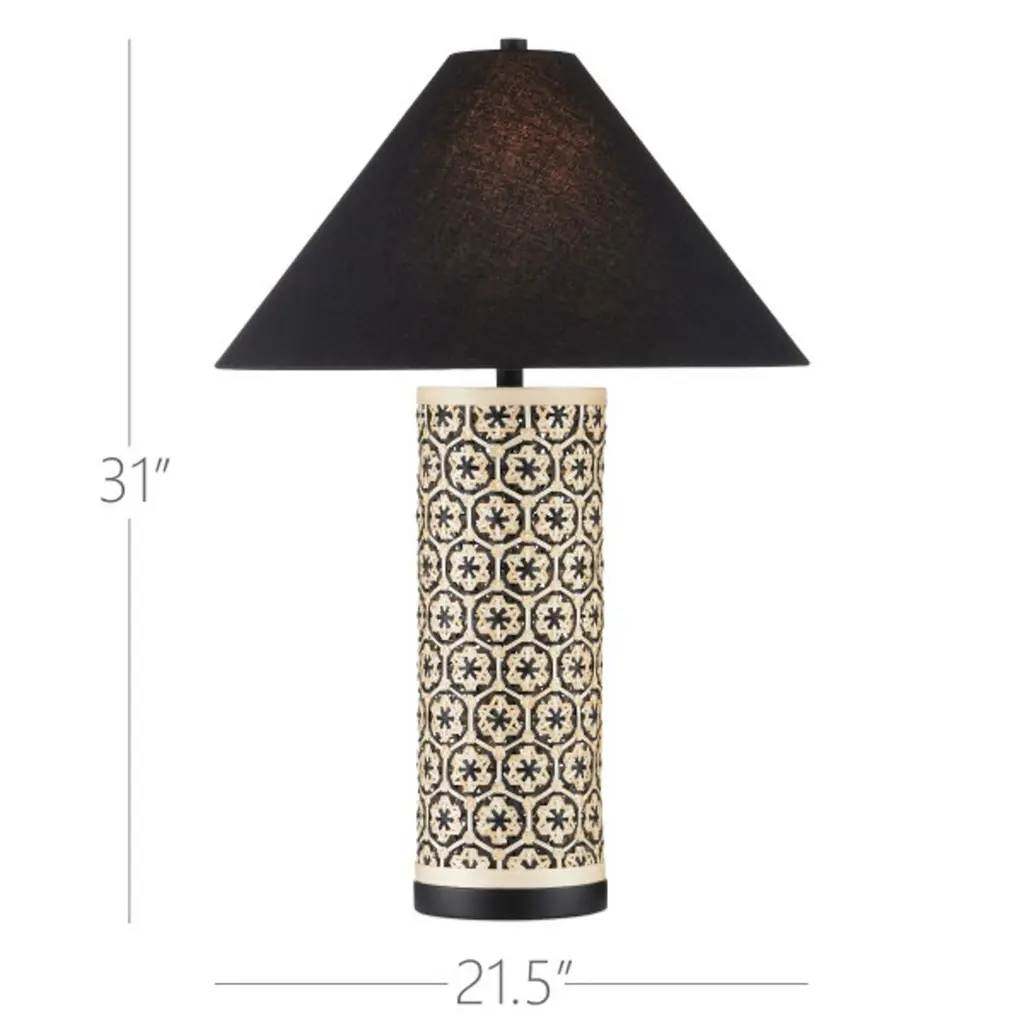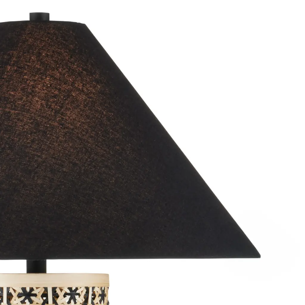 The Nebulon Table Lamp features a columnar body wrapped in handwoven bamboo, showcasing a traditional Vietnamese star-weaving pattern passed down through generations. Crafted from a mix of natural and black-dyed bamboo, each lamp carries slight variations that highlight its handmade character. A black empire shade deepens the visual impact, echoing the woven motifs, while metal hardware and a sleek base complete the design with a subtle, modern contrast.