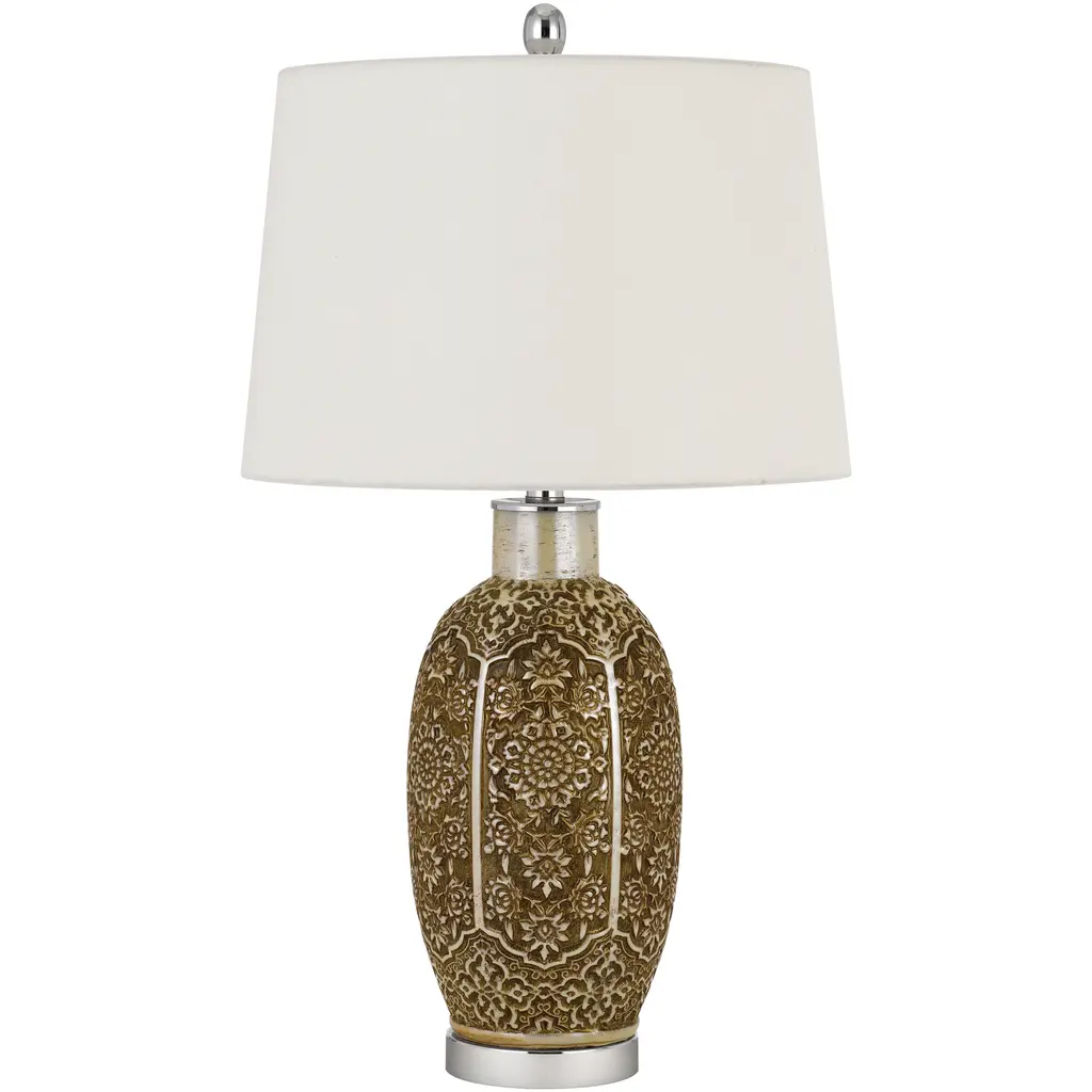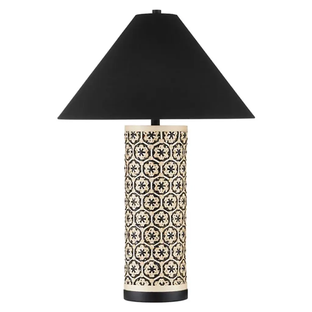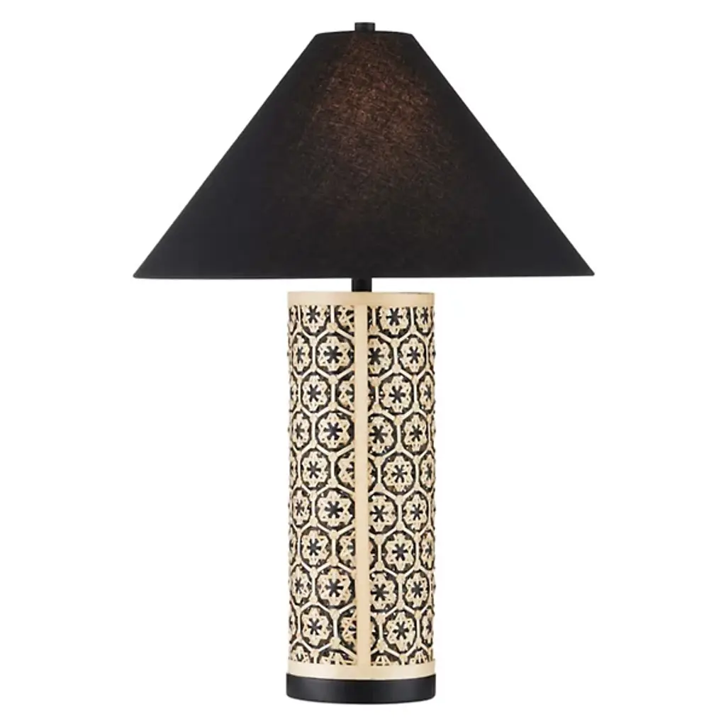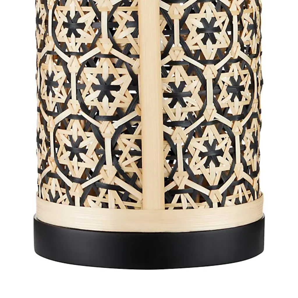 The Nebulon Table Lamp from Currey & Company features a handwoven bamboo design wrapped around a columnar base, utilizing a traditional Vietnamese star-weaving pattern passed down through generations. Natural and dyed bamboo strands create geometric motifs across the surface. Each lamp carries slight variations that highlight its handmade origins, while the weaving technique produces texture that changes as light moves throughout the day. An empire shade echoes the woven motifs below, creating visual continuity between base and shade. Metal hardware anchors the design with modern contrast against the organic bamboo construction.