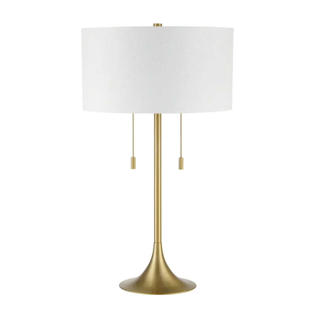 This stunning table lamp is the perfect finishing touch for any room. The Neely Table Lamp from Craftmade comes in your choice of either Brushed Polished Nickel or Satin Brass. The lamp features a large hardback drum shade and has two independent pull chain sockets, allowing for versatile lighting options. Please note that it requires two medium-base bulbs, with a maximum wattage of 60W each (bulbs not included).