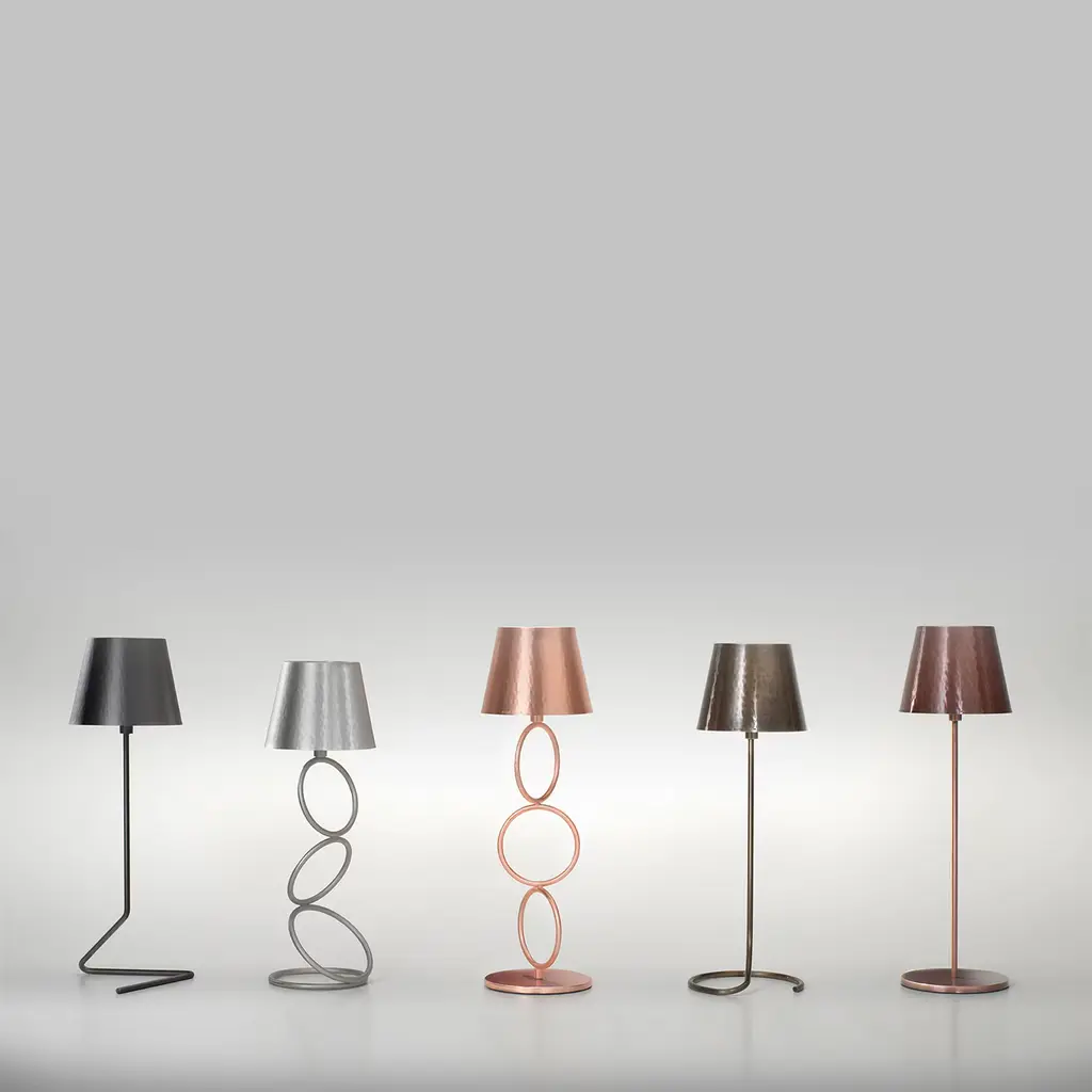 At once sculptural and ethereal, this rechargeable wireless table lamp is an exquisite synthesis of glamorous and minimalist traits. A dynamic composition of rings - base included - traces its sculptural brass alloy body that, completed by a conical hand-hammered diffuser, flaunts an extensive antiqued silver plating maximizing the general brightness potential. More versions are available in the Artemest catalog.