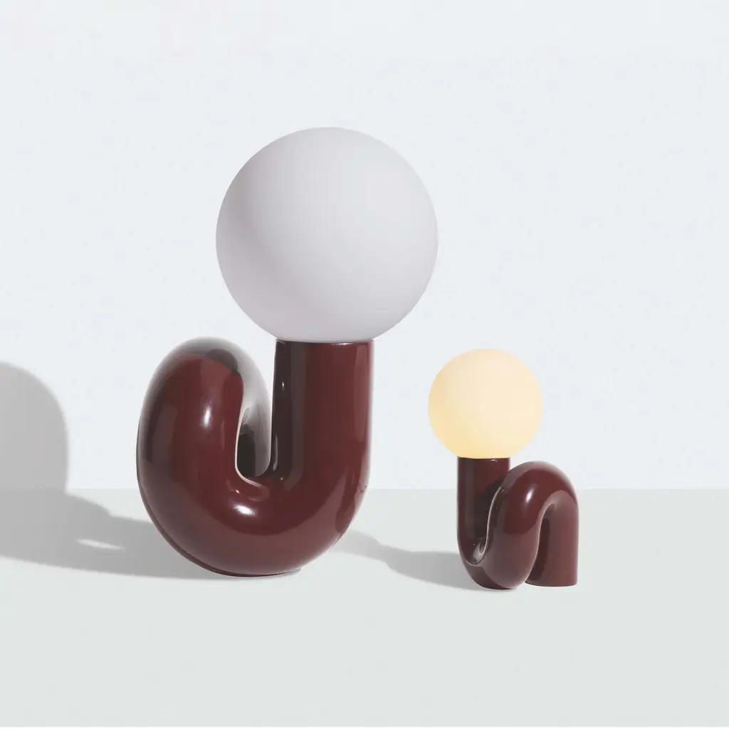 Meant to echo a playful childhood shape, the Neotenic Table Lamp from Petite Friture is both a functional light source and an eye-catching sculptural object. Its generous, squiggle base is topped with a handblown glass orb, adding to the playful eclecticism of the lamp. Bring a pop-art inspired design to your bedside table, entryway table, or open shelving display. Highlights