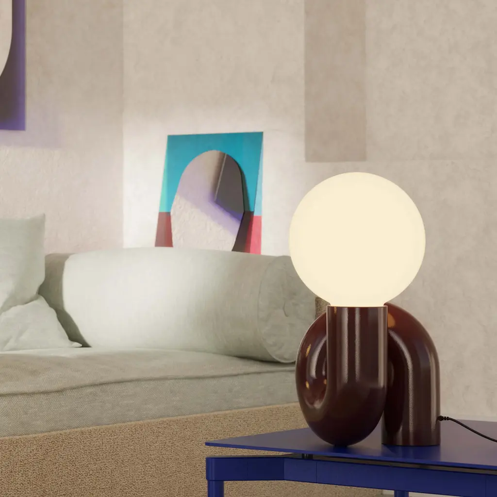 Meant to echo a playful childhood shape, the Neotenic Table Lamp from Petite Friture is both a functional light source and an eye-catching sculptural object. Its generous, squiggle base is topped with a handblown glass orb, adding to the playful eclecticism of the lamp. Bring a pop-art inspired design to your bedside table, entryway table, or open shelving display. Highlights