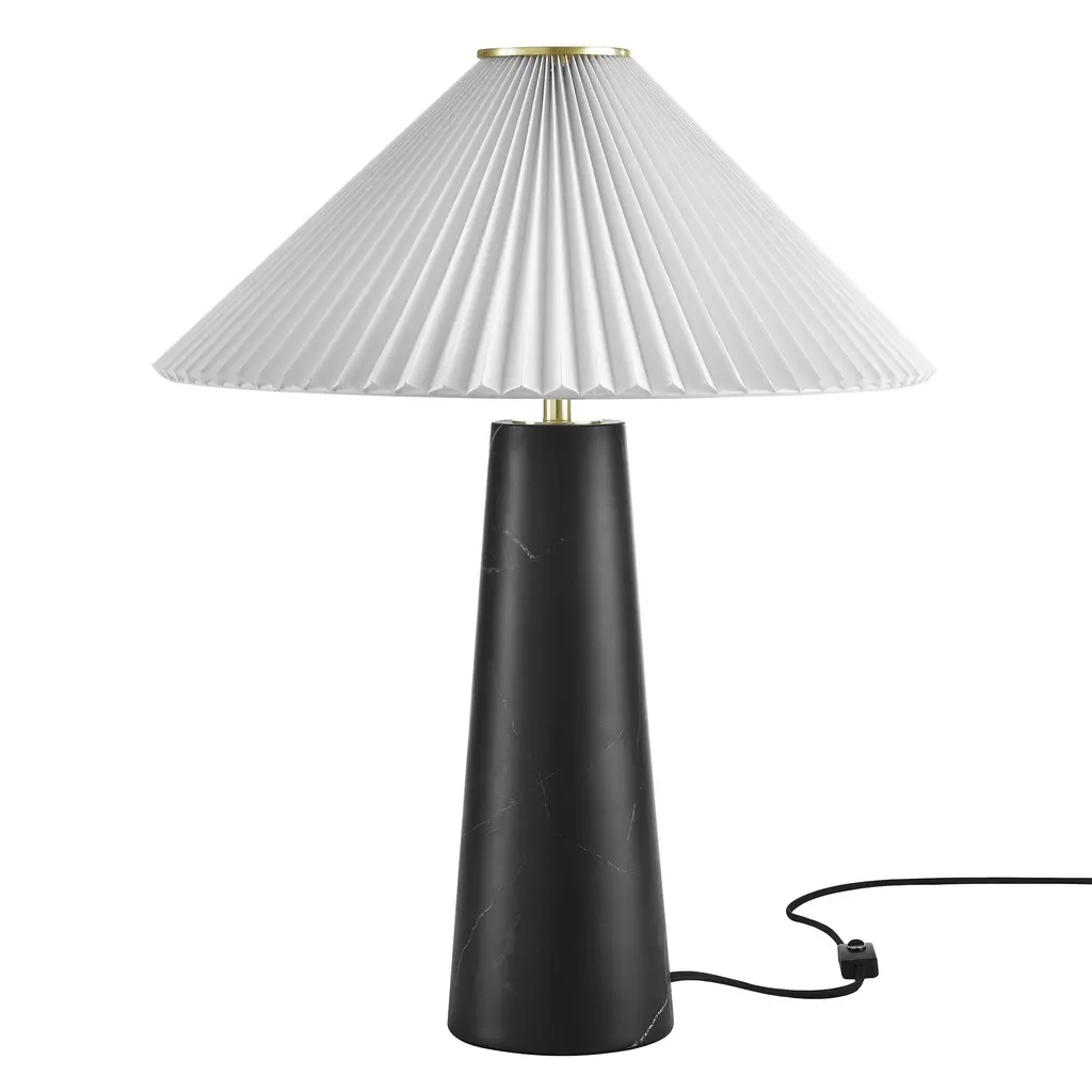 Brighten your space with the warm glow and vintage charm of the Nera Marble Table Lamp. Featuring a sleek metal body with a marble pattern and a pleated fabric lamp shade, this small table lamp mixes great style with everyday practicality. The retro-inspired pleated shade is topped with a brass metal plate, enhancing its look. Ideal as a single living room table lamp, a bedside nightstand lamp, a home office desk light, or for a cozy reading corner, the Nera Faux Marble Lamp emits a soft, ambient glow that creates a warm, inviting atmosphere. The black fabric cable allows this side table lamp to integrate seamlessly into any setting, while the on/off switch adds convenience. ETL listed for safety, this entry table lamp requires one E26 40W bulb (not included). Assembly required.Pleated Lamp Shade with Brass Metal Plate Metal Base with Marble Pattern 70.9" Black Fabric Cable On/Off Switch E26 40W bulb (Not Included) ETL Listed Assembly RequiredOverall Product Dimensions: 20"L x 20"W x 26"HBase Dimension: 6"L x 6"WOne - Nera Metal Table Lamp