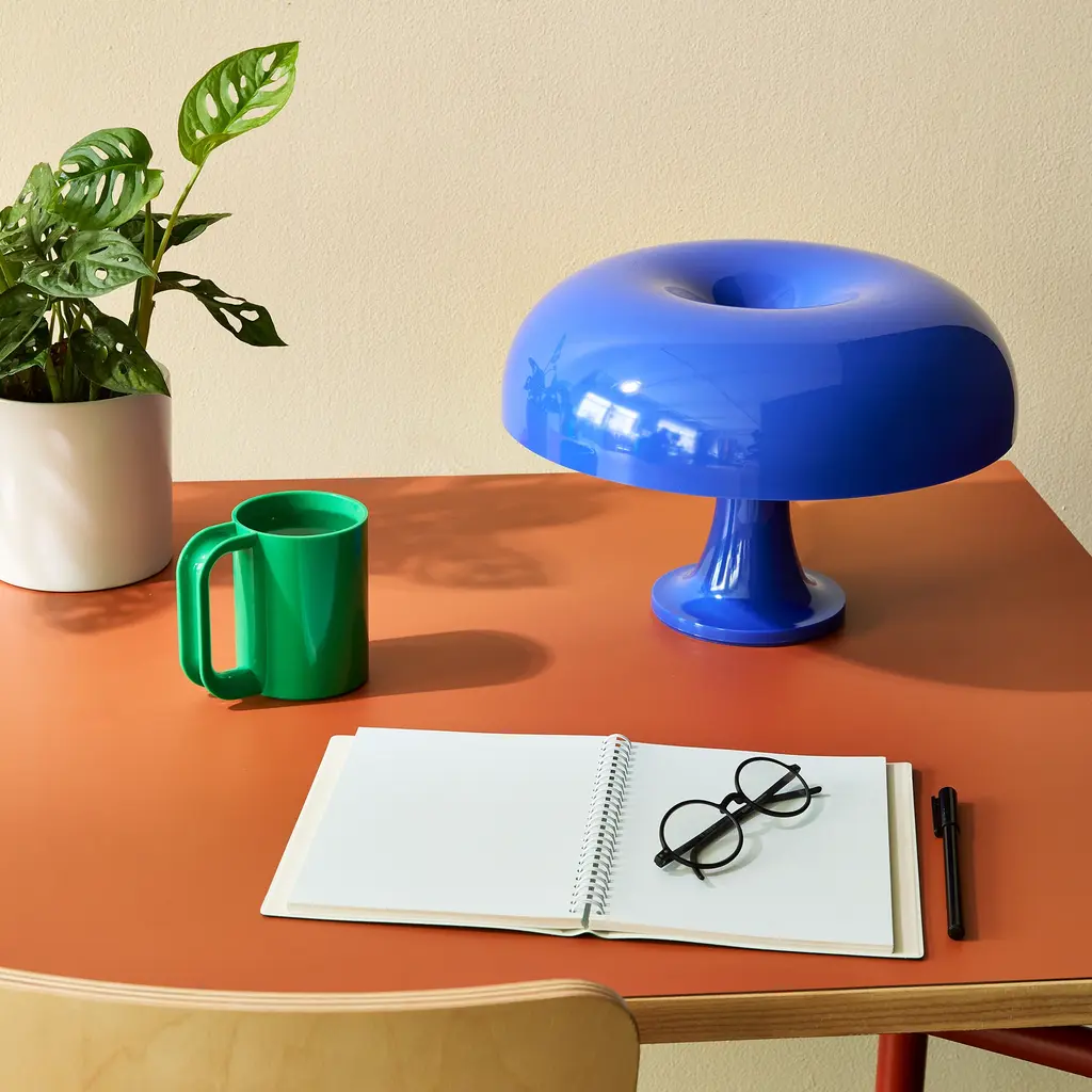A mini version of Giancarlo Mattioli 1965 Nesso Lamp, the Nessino was created by Mattioli in 1967 and is ideal for smaller spaces, bedside tables and desks. Like the Nesso, the Nessino’s design was guided by the era’s enthusiasm for space-age forms and materials, and experimentations with then-newly-available thermoplastic resins. The Nessino Lamp’s eye-catching shape provides diffused incandescent light. Produced by Artemide, the Nessino Mini Table Lamp has an on/off switch on its cord and measures 8h x 13"diam. E12 candelabra base, requires four incandescent 25W max bulb (not included.)
