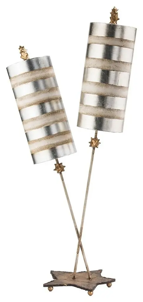 Illuminate your space in a Charming Whimsical style with this 40" double Buffet Table lamp. Displaying Hand sculpted resin and a clean painted finish, this lamp features a unique silver striped shade topped with a carved finial in antique gold. Bright light at the top and bottom give the perfect amount of light for your space. A star shaped base in Flambeau's distressed gold , and a simple on off switch on the cord, makes this Large Table lamp easy to operate, and functional while showing off its updated traditional looks.