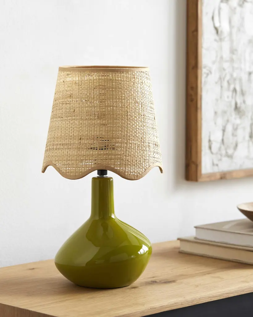 Collection: Neuenhagen Colors: Green, Peach, Translucent Material: Body: Ceramic,Shade (Outside): Rattan,Shade (Inside): Metal Styles: Southwestern Made In: China Lighting Type: Accent Table Lighting Shade Material: RattanMetal Shade Color: WheatWheat Cord Length: 6' Switch Type: On/Off Number of Bulbs: 1 Socket Type: E-26 Bulb Wattage: 60W