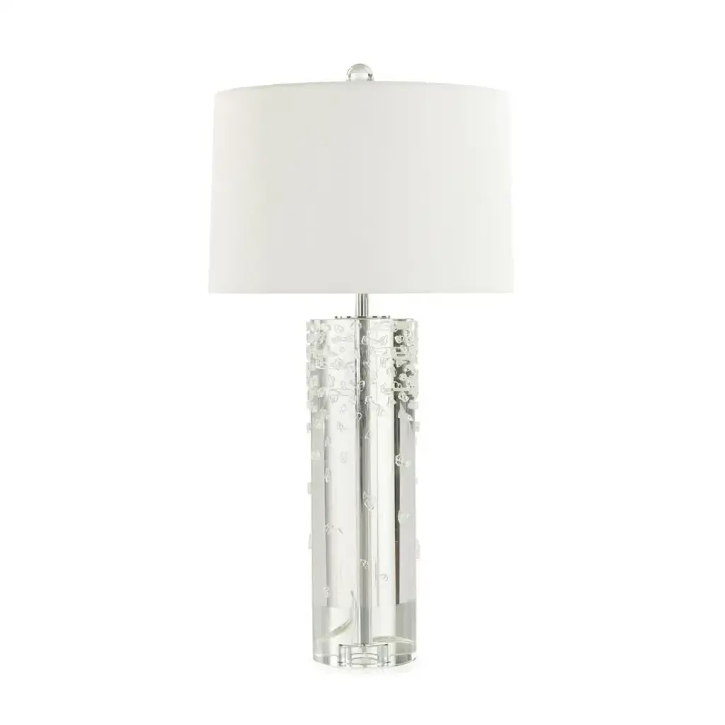 The Nevasca is a pristine design statement that infuses a space with clear tones and subtle, intricate textures. Crafted from glass, the piece showcases a simple, cylindrical shape, adorned with tempered glass shards to evoke the look of a winter snowfall. This gorgeous table lamp features Polished Nickel hardware and an acrylic ball finial, enhancing the look.