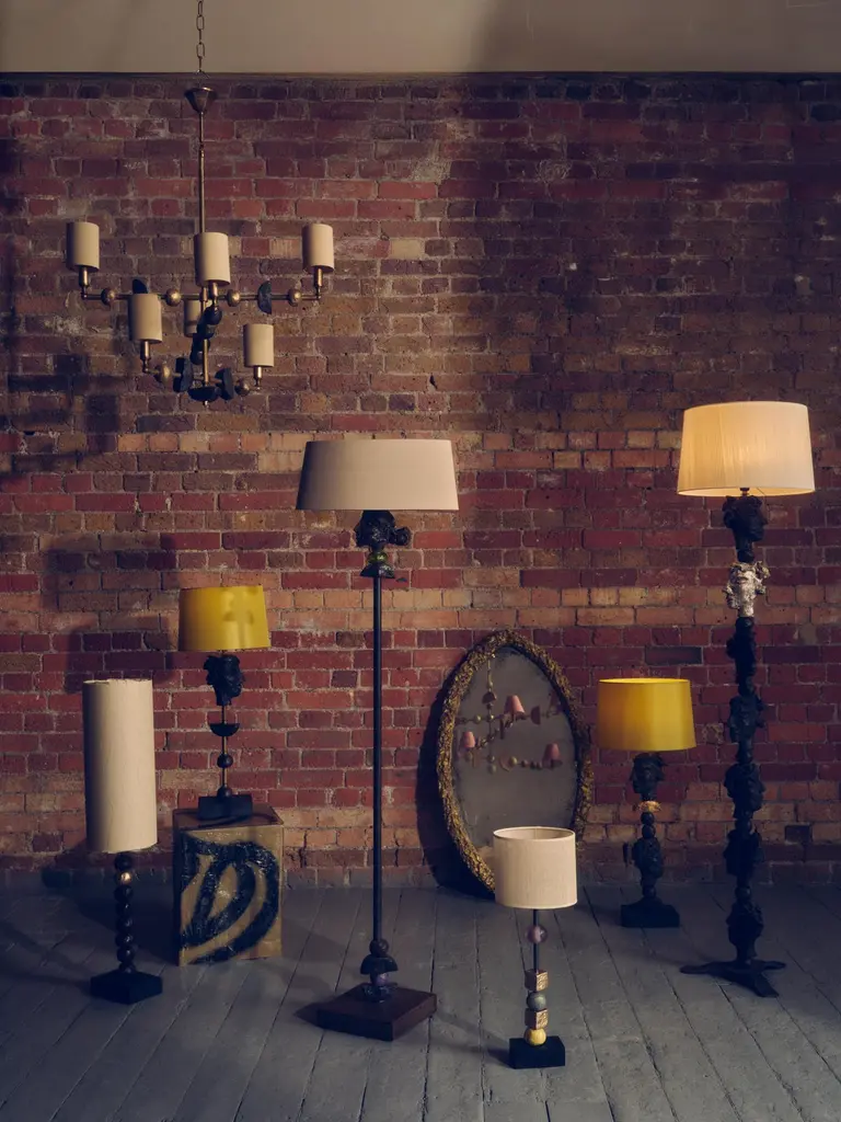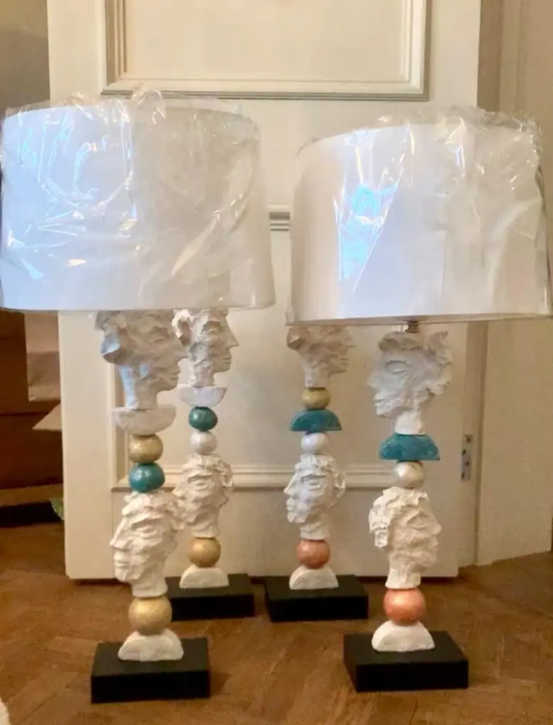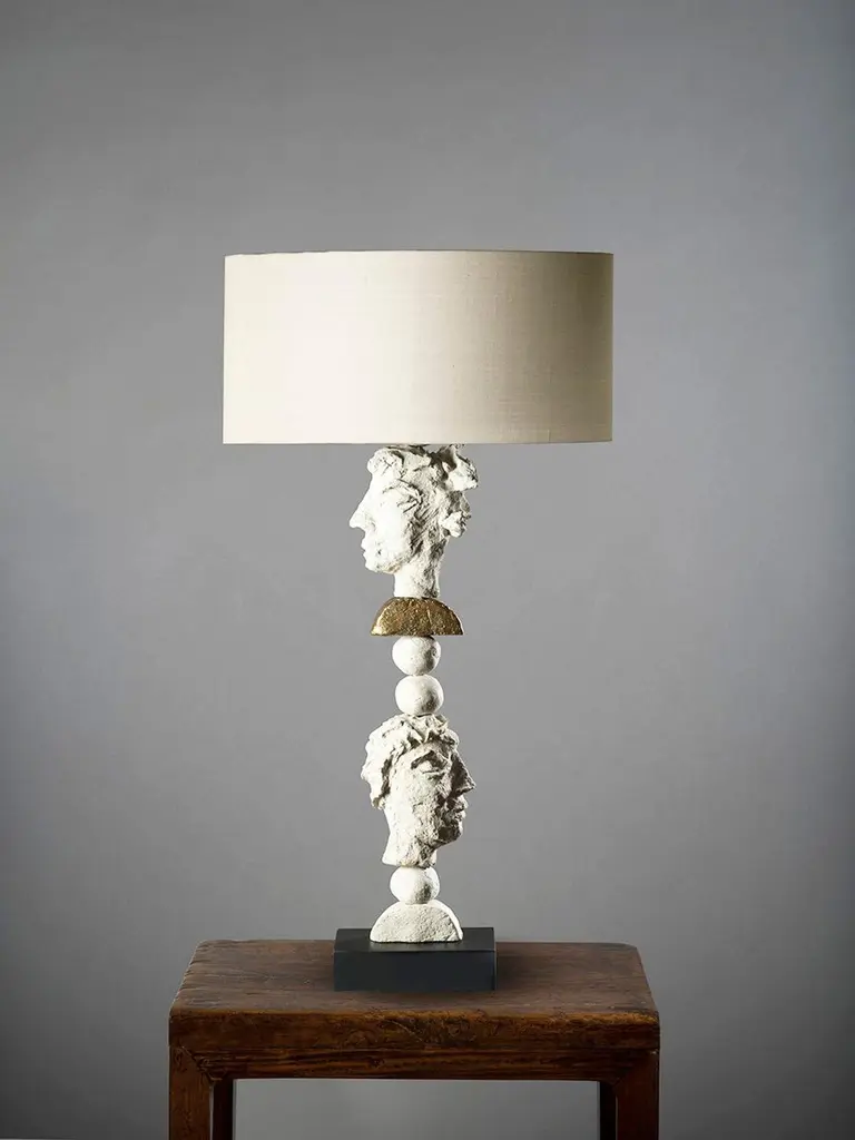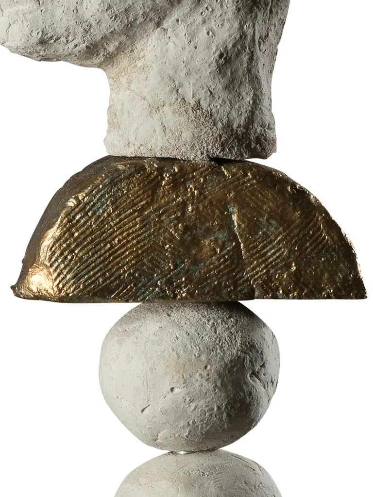 This contemporary Margit Wittig table lamp sits on a rectangular slate base and features multiple white resin handcrafted spheres and semi-circles with organic surface textures. A single central semicircle is enveloped in 24-karat gold leaf, done by hand.These shapes are separated by two abstract sculptural portraits, sculpted by Margit Wittig and cast in her London studio. Margit Wittig is inspired by modern artists and sculptors such as Giacometti and Ivon Hitchens. Her work is constantly evolving using different textures as the driving force, intertwined with her work with color. Her functional art spreads the gamit from modern simplicity to rich and complex designs and color. Her pieces are placed with collectors around the globe.Please note: Although our lights are wired using UL listed components for the US, each light fitting is not UL listed.UK customers please note: displayed prices do not include VAT.