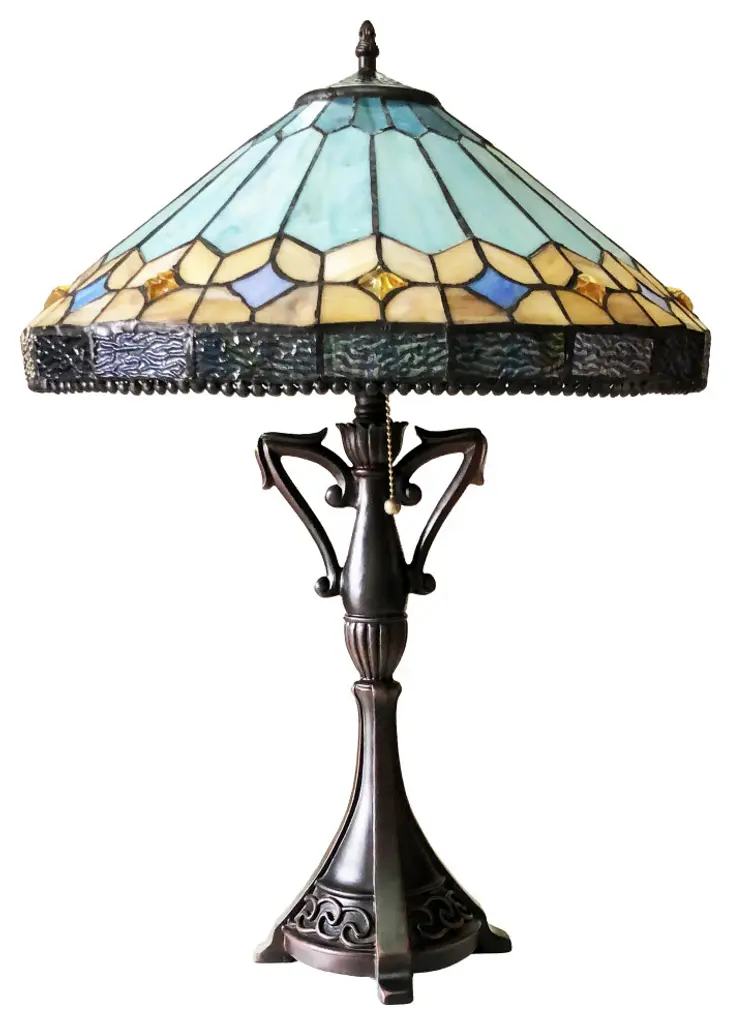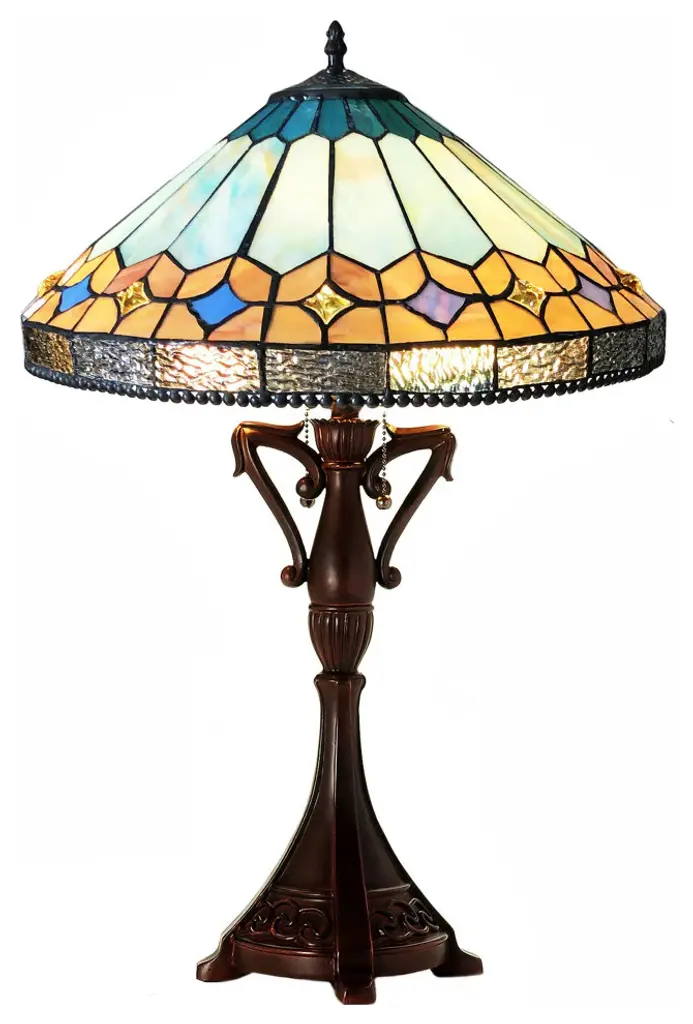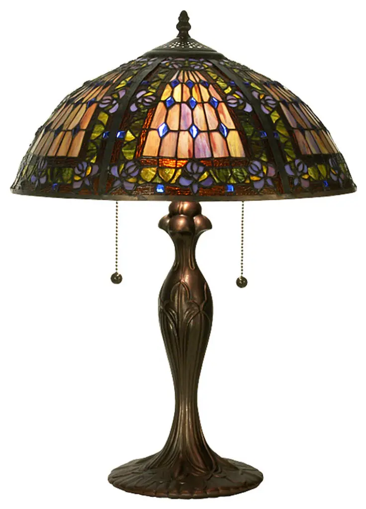 This is a very chic, tiffany-style stained glass table lamp, featuring over 160 pieces of hand cut, stained art glass and 15 glass beads, accenting around the shade, and a nicely designed antique bronze base. Each wrapped glass piece and glass bead is lined in a fine copper foil and soldered together at high heat to form each unique shade. It is hand created using the same technique developed by Louis Comfort Tiffany in the early 1900''s. Each piece is unique, and is sure to catch everyone''s eye with it''s vibrant colors.