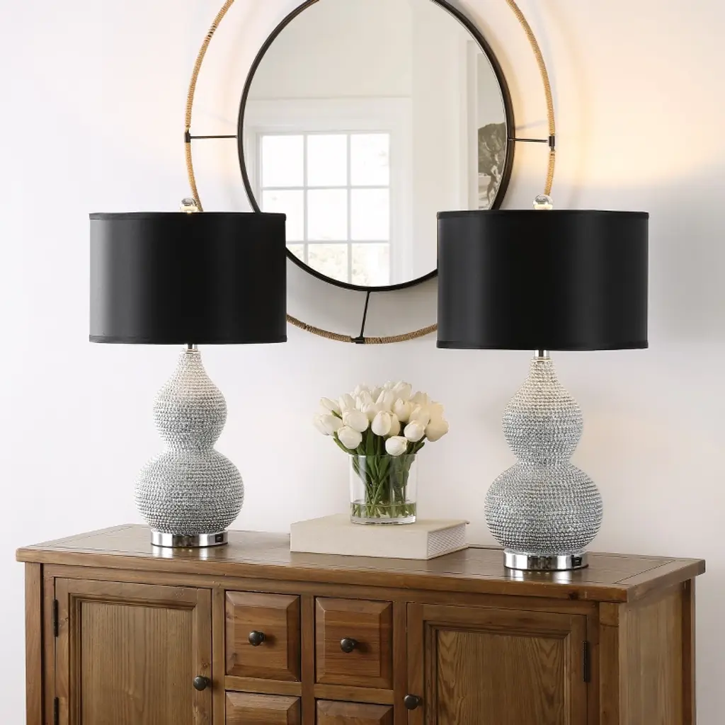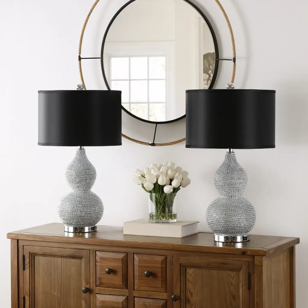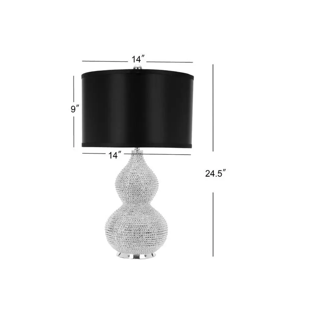 Illuminate your space with style and functionality using the Nicole table lamp set. Designed to bring a touch of elegance to any room, this pair of 24.5 inch lamps comes in a chic silver finish that enriches your decor. Crafted from a combination of silver plated poly resin and iron, each lamp boasts a sleek silhouette complemented by a sophisticated black shade. The addition of a USB port ensures that your devices stay charged, combining convenience with timeless design. Place them on your bedside tables or in the living room for a modern accent that radiates warmth. Let the Nicole table lamp set be the perfect touch to enhance your living space with a blend of form and function.