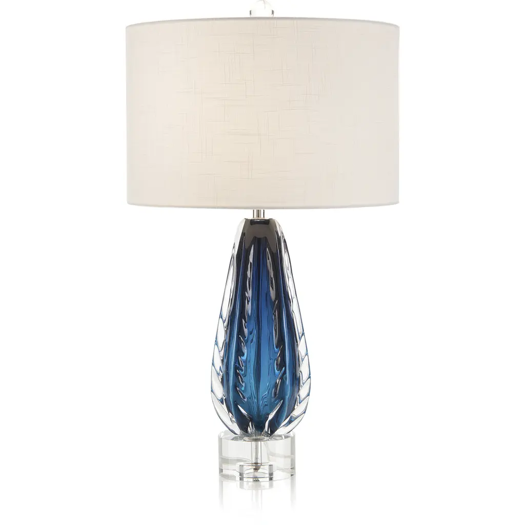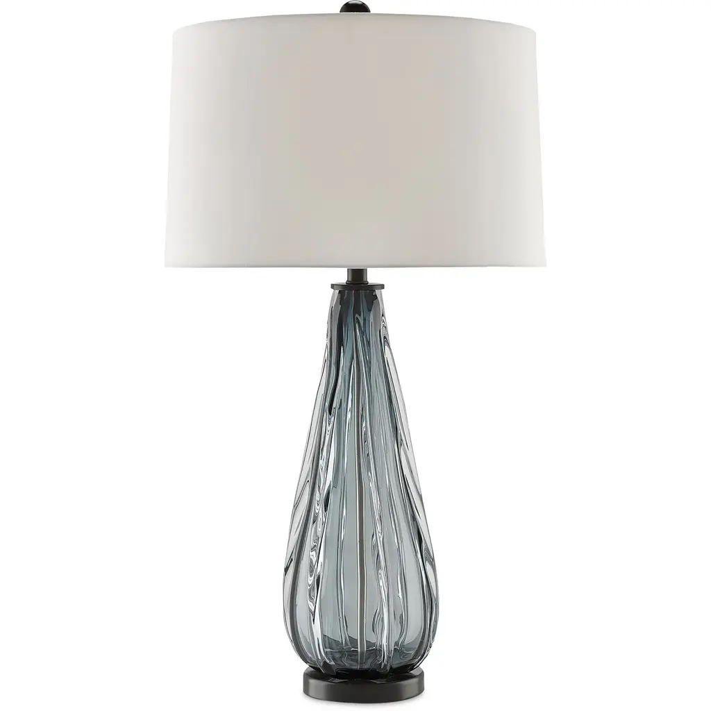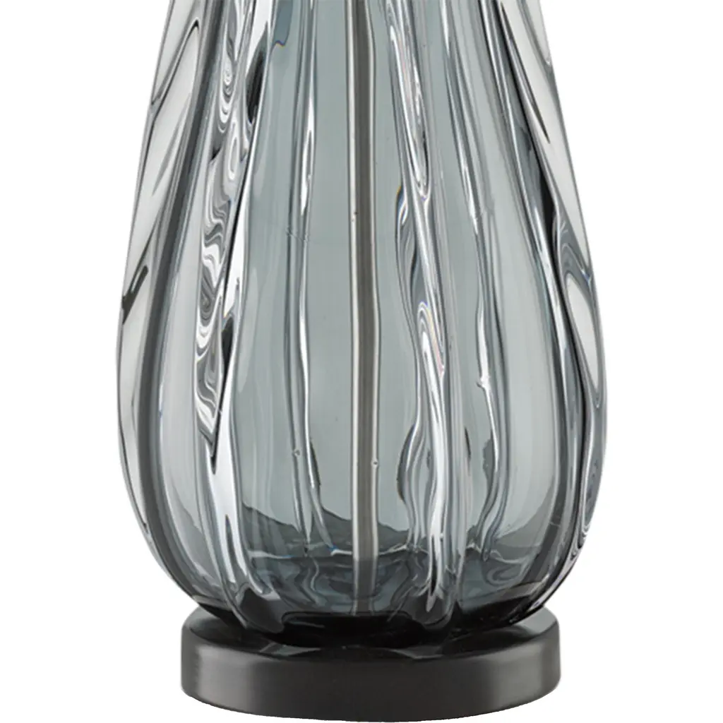 Place the Nightcap Table Lamp on a bedside table and it will be the last thing you toast each night as you turn out the lights at bedtime. Its stylishly stunning column of glass is hand-formed with vertical ribbing throughout the blue-gray blown glass. Satin black hardware enhances the smoky appeal of the lamp, which stands 33 inches high and is topped with an off-white shantung shade.