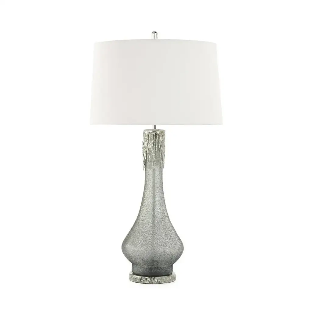 The Nightfall Table Lamp is a gorgeous home accent that presents a sophisticated ambiance to an interior space. This stunning glass lamp showcases a rounded profile elevated by a dark, misty look. Elegant brass accents in a Nickel finish cascade from the neck, matched by a circular aluminum base and cylindrical finial.