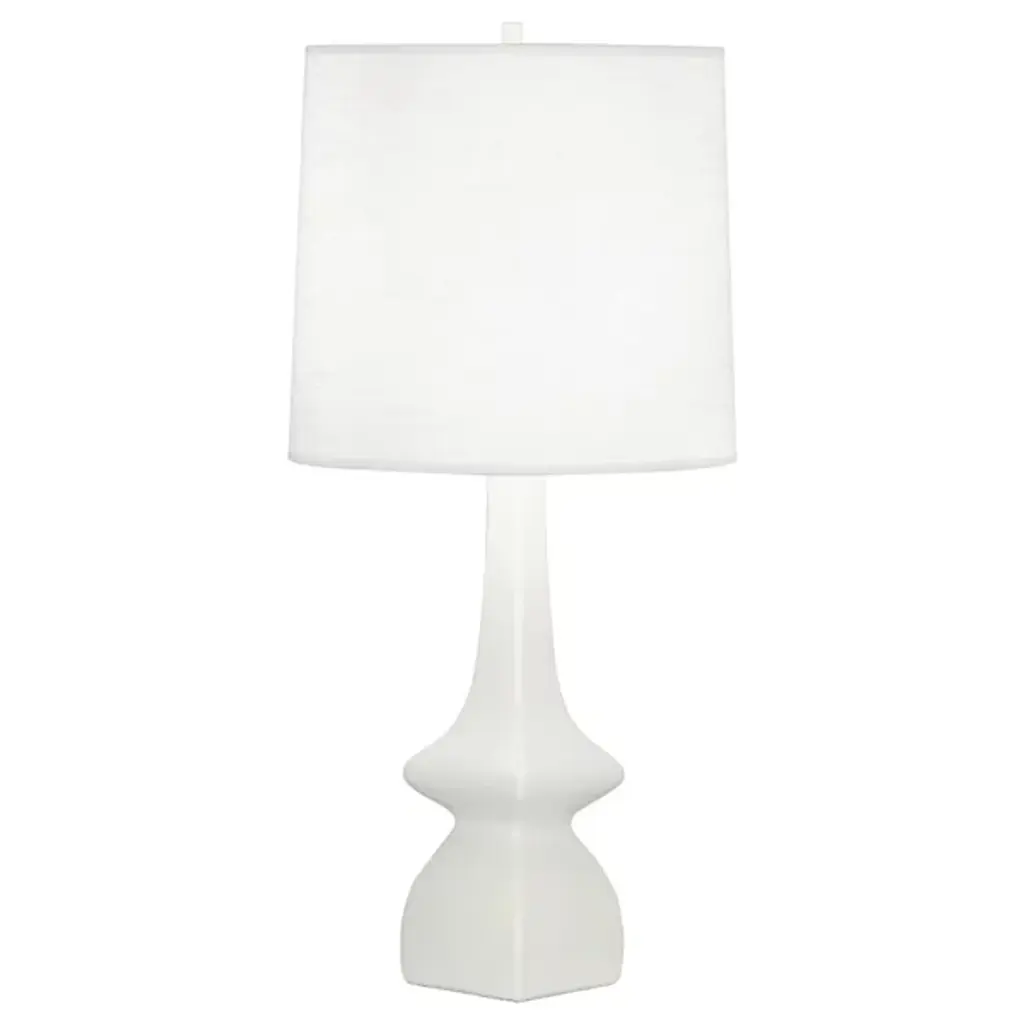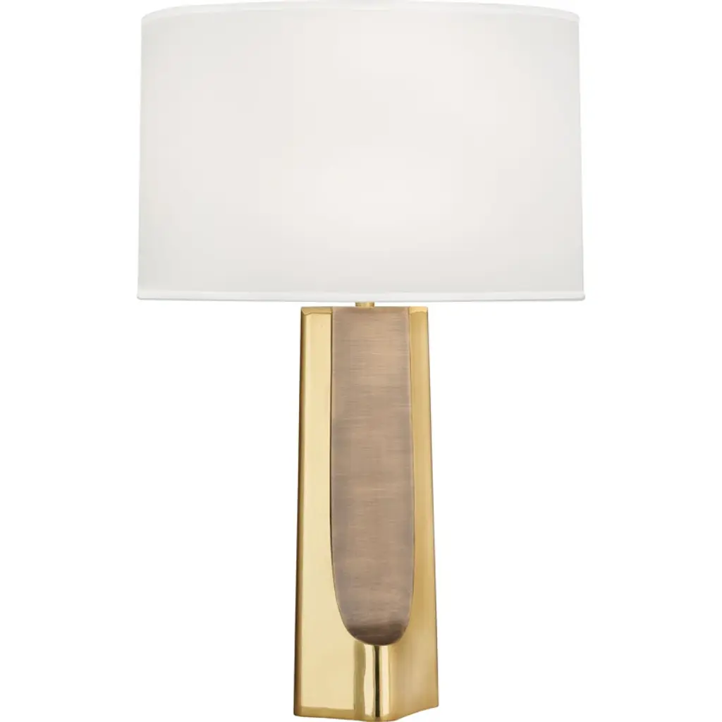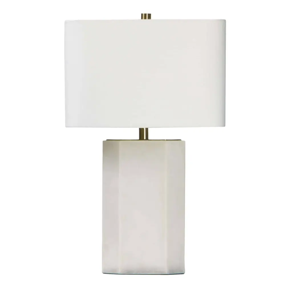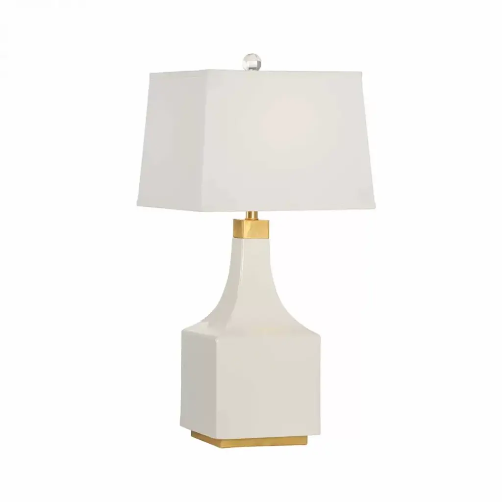This simple yet sculptural table lamp from designer Thomas O'Brien is crafted of ceramic with a glossy ivory glaze on its faceted form. Brass details and a boxy linen shade complete the design.