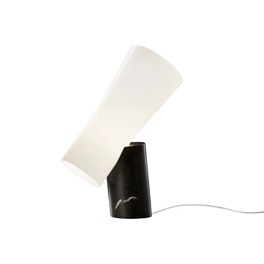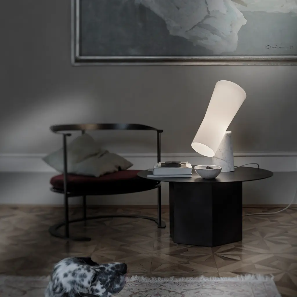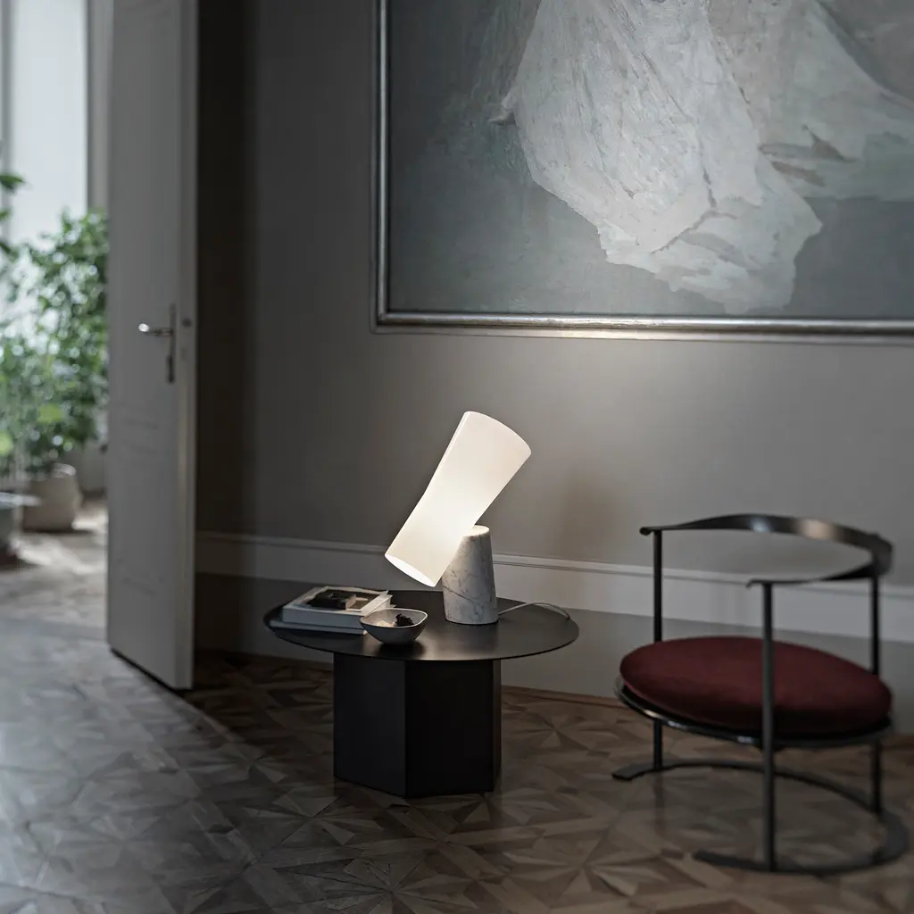 Nile is a study in poised imbalance. Rodolfo Dordoni sets a tapering cylinder of Carrara or Marquina marble on its edge, then lets a hand-blown glass shade lean against it like a sail catching wind off the river it’s named for. By day the piece reads as sculpture—stone veining against the milky translucence of the glass. Switch it on and the lamp comes alive: a warm wash of light spills downward onto the desk or console while twin slits at the top and base send subtle beams upward, accentuating the shade’s delicately pinched profile. The contrast of cool marble and glowing glass gives Nile an almost architectural gravitas, yet its footprint is compact enough for an entry table, bedside, or moody bar corner. Made in Italy and finished by hand, each lamp is a unique conversation between material heft and luminous grace—an elegant reminder that equilibrium can be both unexpected and utterly captivating.