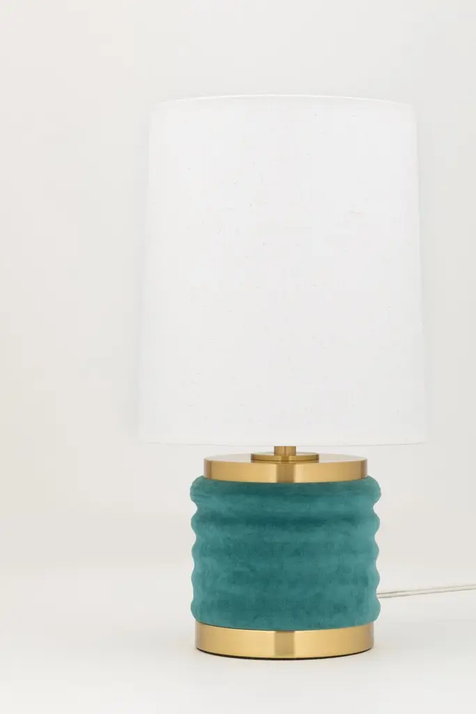 Yes, that's velvet draping this table lamp's curves, providing an unexpected textural complement to the gleaming brass base and neck. The Belgian linen shade adds timeless elegance.