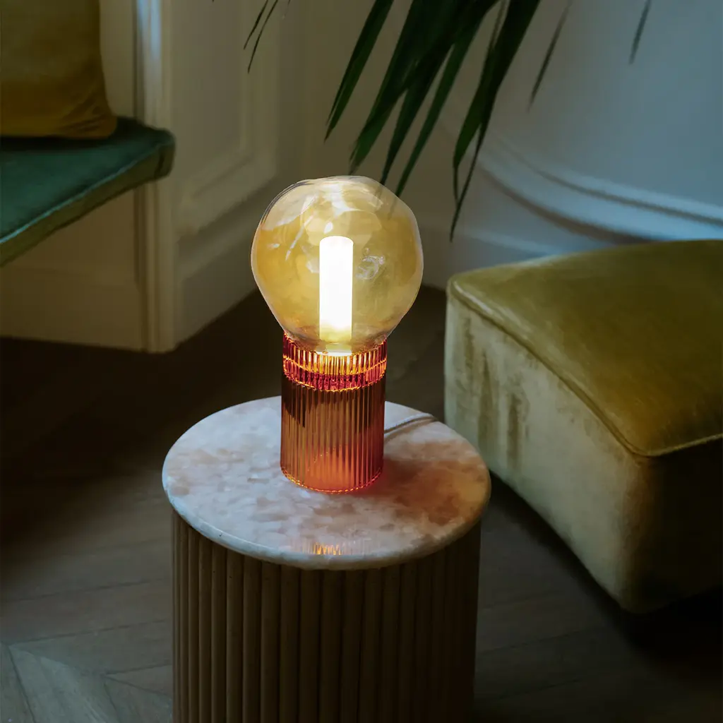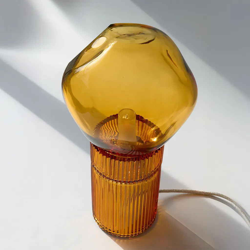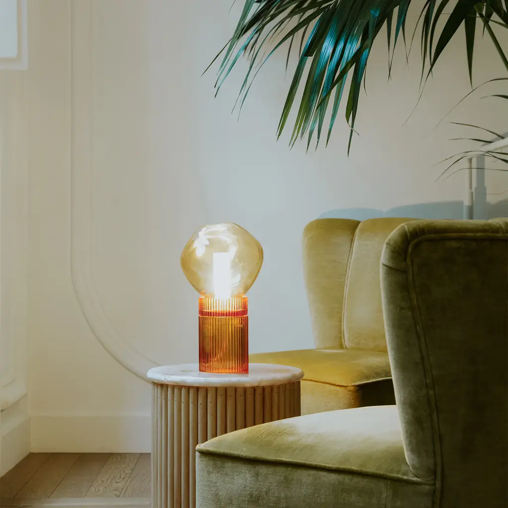 Nina Nuvola, inspired by Rome’s elegant “Colonnina” columns, is a hand-blown lead crystal table lamp that blends classical beauty with modern design. Its amber, hand-engraved crystal base creates mesmerizing light reflections. The amber interchangeable top allows for customized combinations and doubles as an elegant flower vase. The fabric-covered electrical cord enhances its artisanal luxury. A symbol of elegance and balance, Nina Nuvola enhances any space.