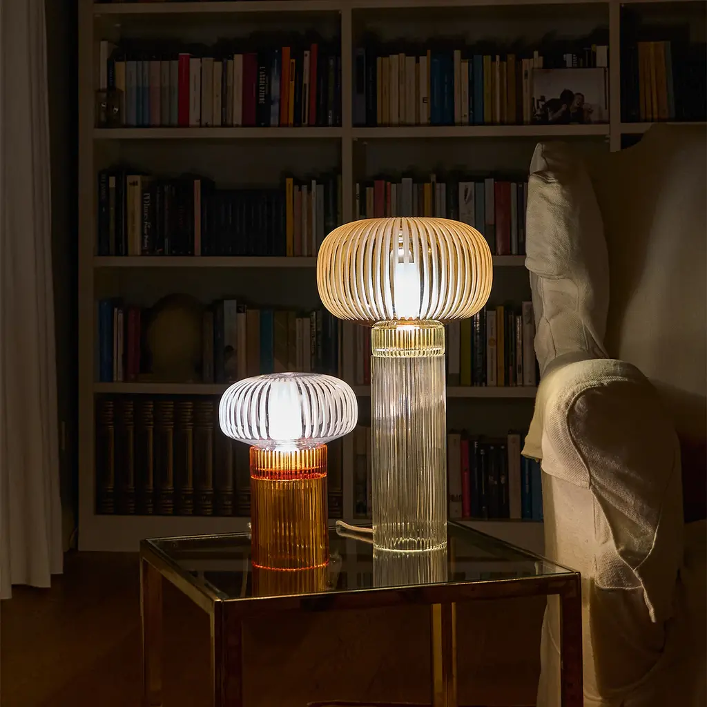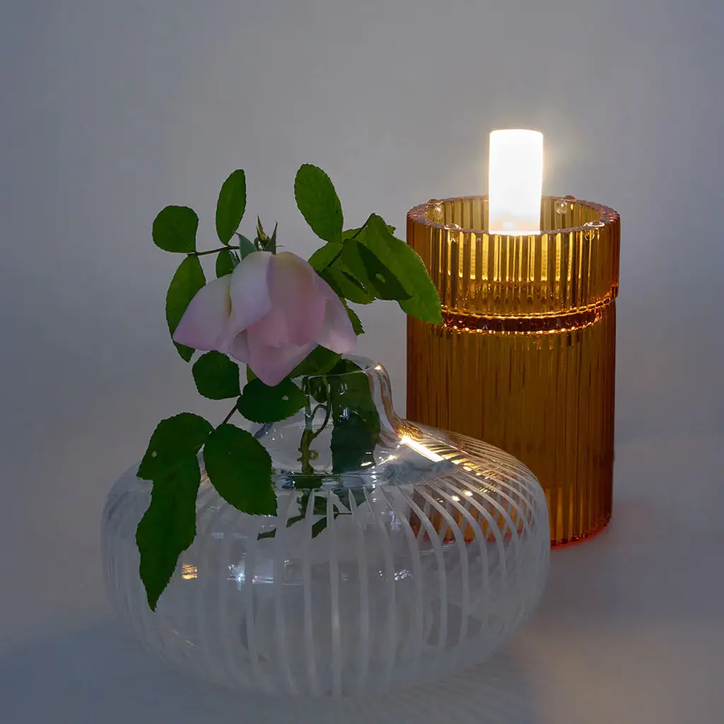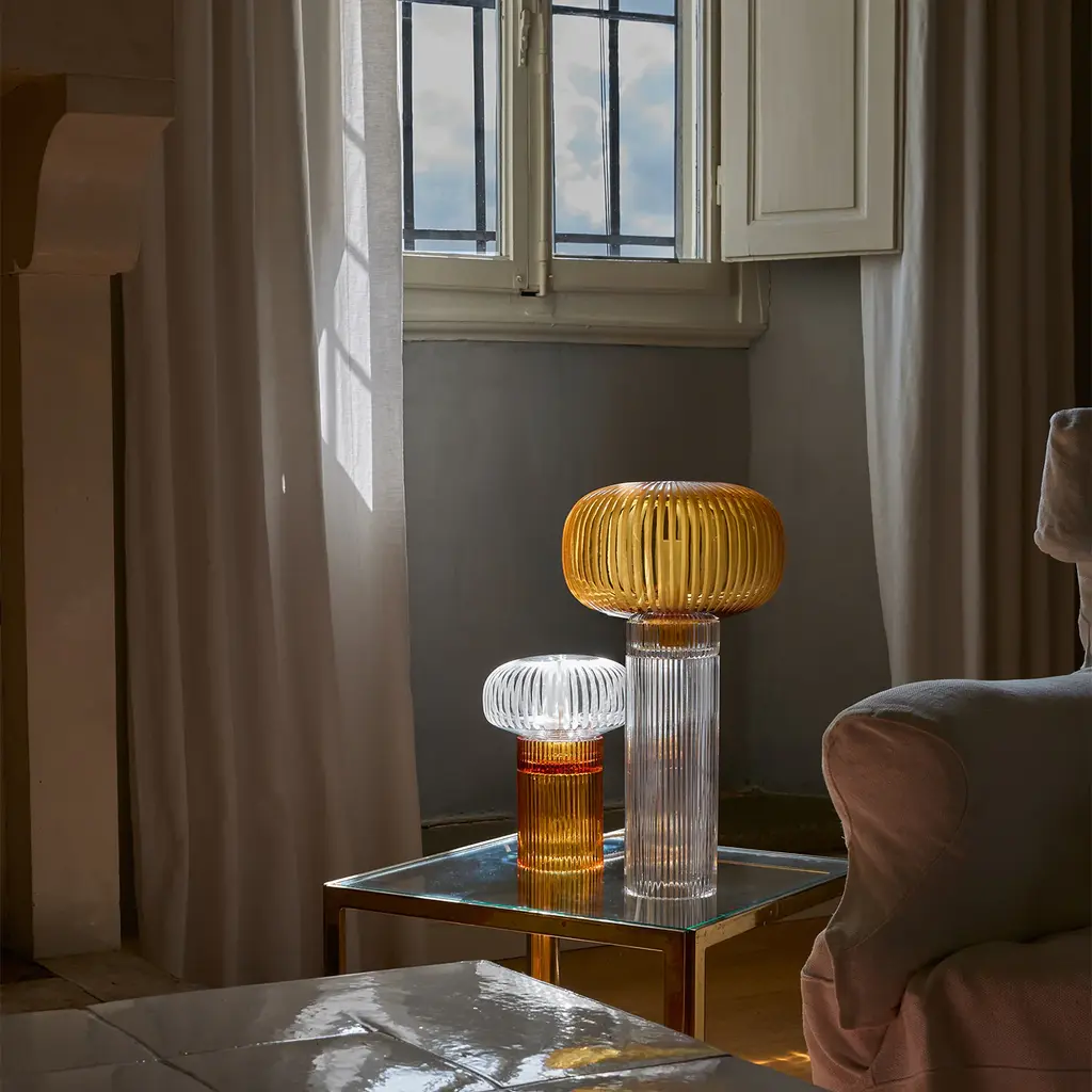 Nina, inspired by the grace of Rome’s “Colonnina” columns, is a hand-blown lead crystal table lamp that fuses classical elegance with modern design. Its hand-engraved, the amber column-like base creates mesmerizing light effects, adding depth and refinement. The interchangeable top allows for customized combinations and doubles as an elegant flower vase. The fabric-covered electrical cord enhances its artisanal luxury, making Nina a statement piece in any space.