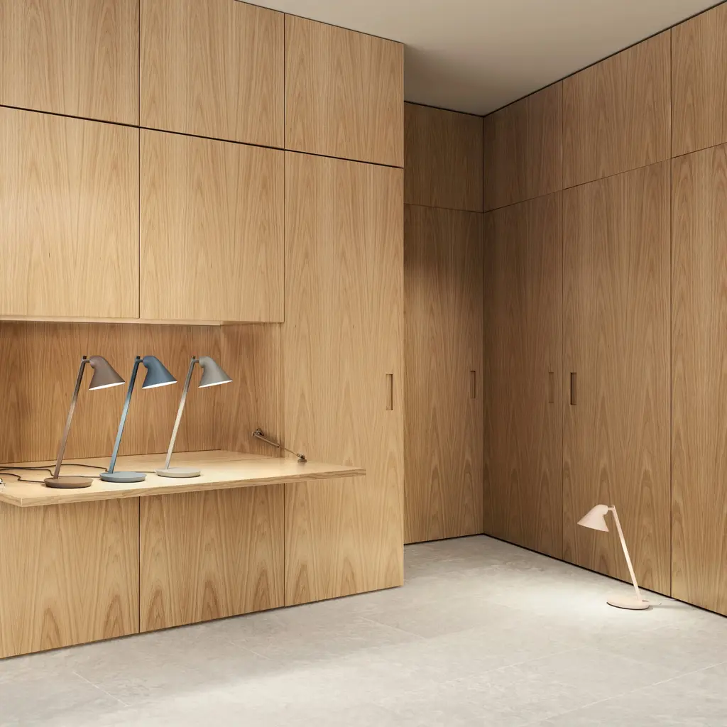 The NJP Mini Table Lamp by Louis Poulsen, designed by Nendo, is a compact and versatile addition to the NJP series. This scaled-down version offers the same modern functionality with a sleek, minimal design. The lamp's flexible arm and 342° rotatable head allow for precise light direction, making it ideal for small desks, bedside tables, or shelves. Its LED light source provides soft, glare-free illumination, with dimming and timer options for added convenience. Available in seven colors.