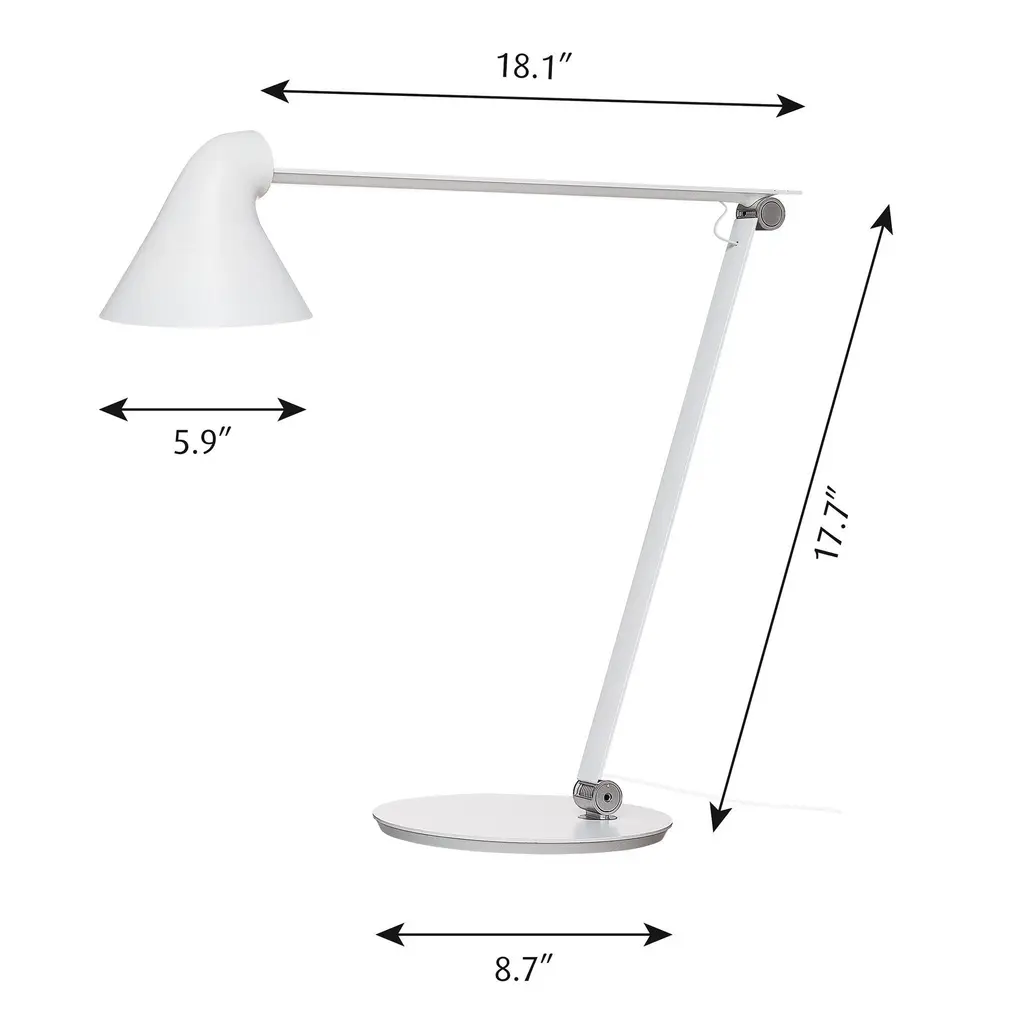 High/Low/Off button on the fixture head. Timer function for 4 or 8 hrs. cULus listed, Dry location. The lamp was designed by Nendo design studio of Japan and designer Oki Sato. NJP Table is a new interpretation of the classic architect lamp. Its simple and honest look bares the lamp's functional components, and makes it self-explanatory in its expression. The lamp's applications have been considered in every detail: The two joints on the arm offers great flexibility making it easy to set the lamp position. As an added touch, the springs are exposed in the arm joints, and contribute to the lamp's decorative expression. In the same way, the rear shade opening towards the arm provides stepless adjustment of the head and ventilation for the LED units.