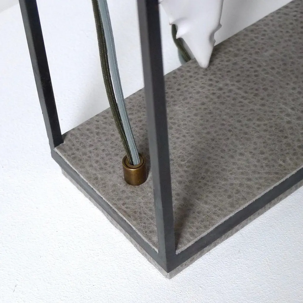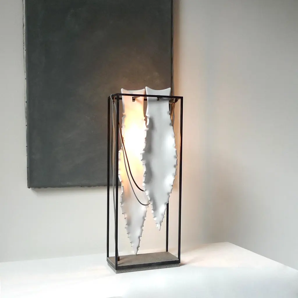 Framed Agave leafs table lamp by Sander BottingaDimensions: W 10 x D 10 x H 53 cmMaterials: Ceramic, forged ironHandmade matte white Agave leaves in ceramics from the ceramic village Grottaglie / Puglia in the south of Italy.Framed in hand forged iron frame. A leather inlaid base and dimmer.I’ve always been inspired by light objects, forms, colors and authentic materials. I love to create and work with my hands.After working for various interior and design companies in the last 20 years, I have now designed my own collection of interior objects.All the objects are meticulously handcrafted in a limited series, sometimes in corporation with small artisan workshops.This results in unique handmade objects with their own identity. There is also the option to order custom made objects – for both projects and personal use.All our lamps can be wired according to each country. If sold to the USA it will be wired for the USA for instance.