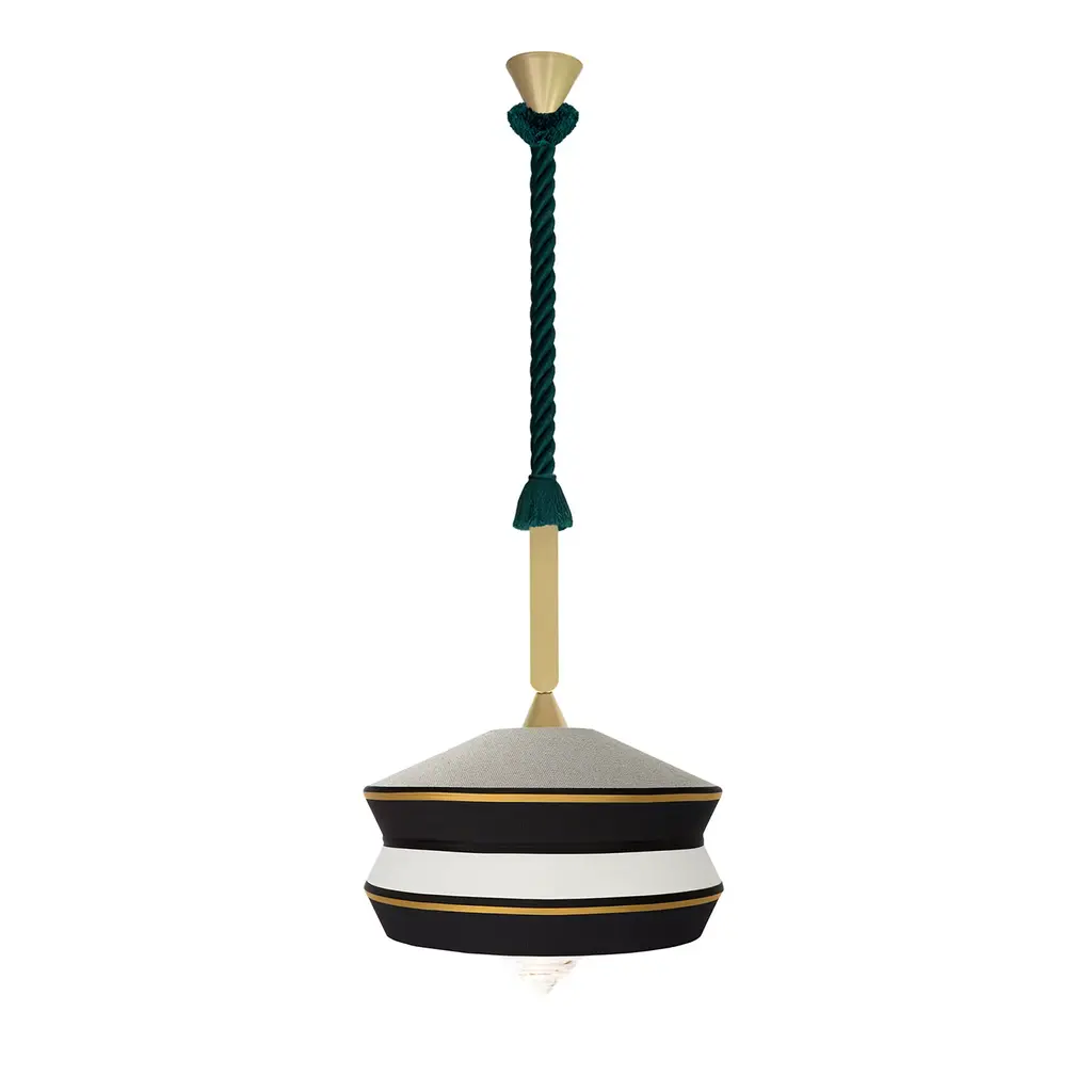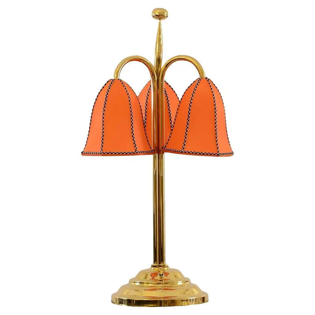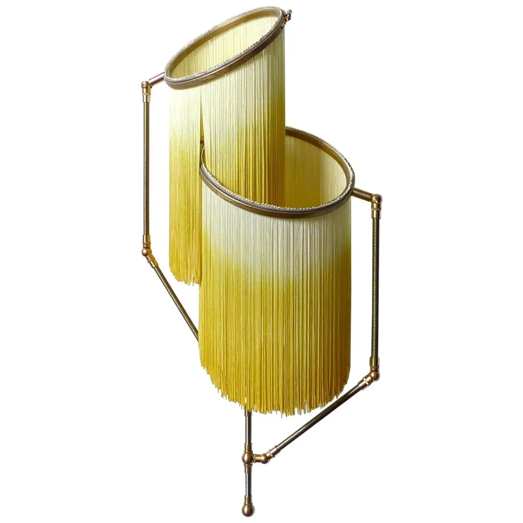 Charme table lamp by Sander Bottinga.Dimensions: H 73 x W 38 x D 25 cmHand-sculpted in brass, leather, wood and dip dyed colored Fringes in viscose.The movable arms makes it possible to move the circles with fringes in differed positions.So you can change the light object in multiple models.The brass lamp base, lamp holder and dimmer are inlaid with leather.The design artwork is meticulously handcrafted in a limited series, sometimes in corporation with small artisan workshops.All our lamps can be wired according to each country. If sold to the USA it will be wired for the USA for instance.