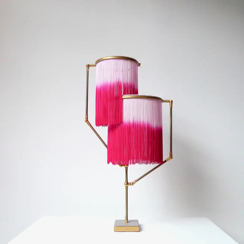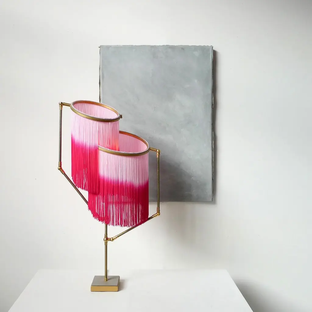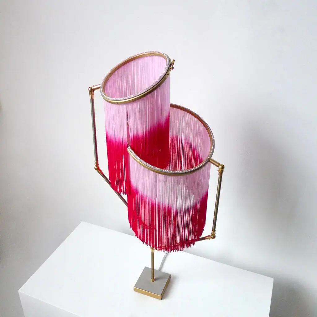 Pink charme table lamp, Sander BottingaDimensions: H 73 x W 38 x D 25 cmHandmade in brass, leather, wood and dip dyed colored Fringes in viscose.The movable arms makes it possible to move the circles with fringes in different positions.So you can change the light object in multiple compositions.The brass lamp base, lamp holder and dimmer are inlaid with leather.Only for Led light bulbs.The design artwork is meticulously handcrafted in a limited series, sometimes in corporation with small artisan workshops.All our lamps can be wired according to each country. If sold to the USA it will be wired for the USA for instance.