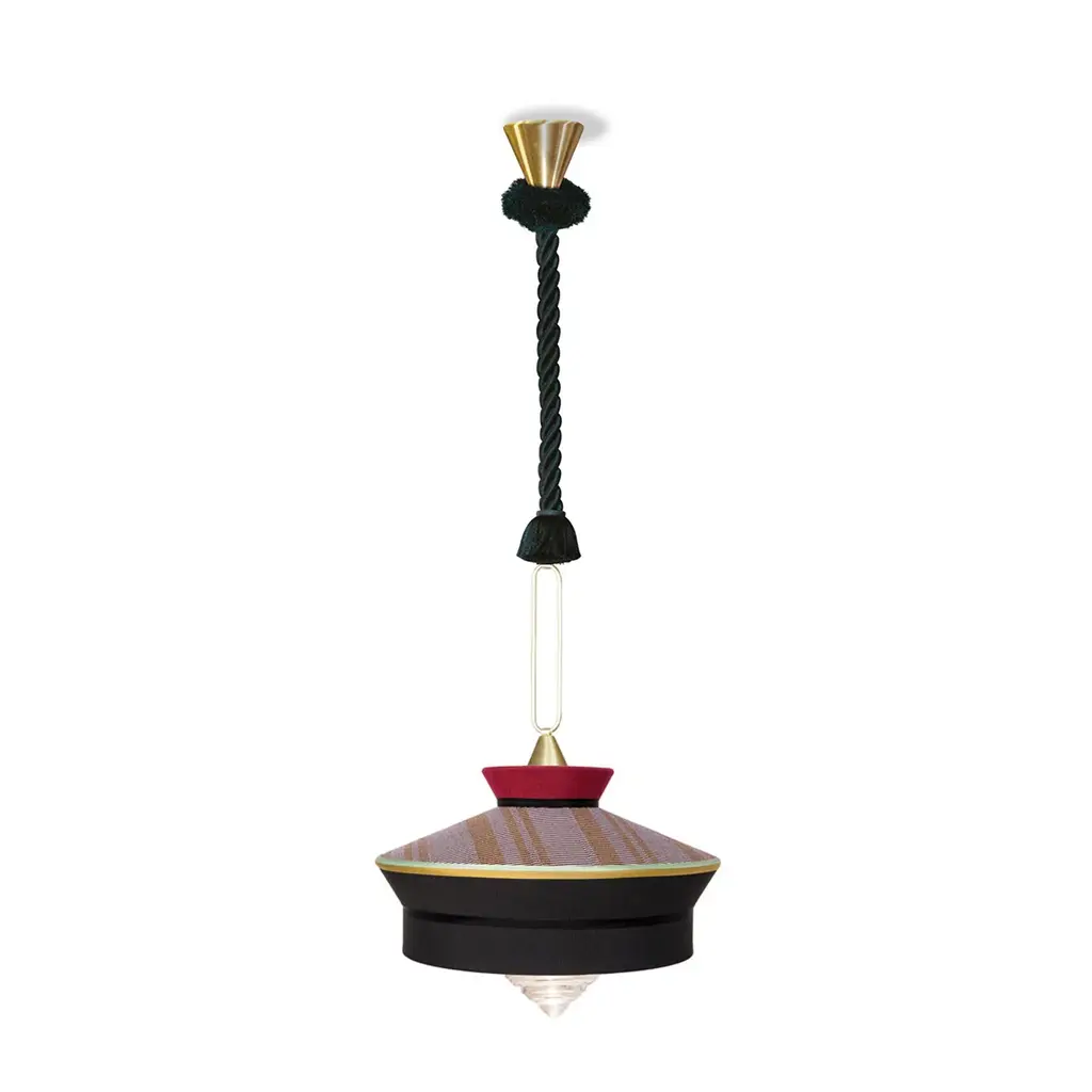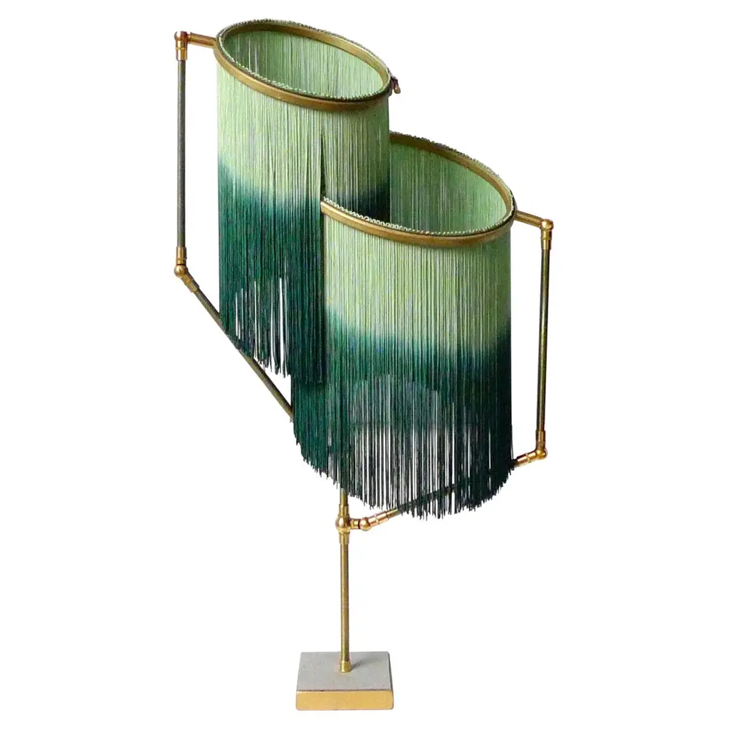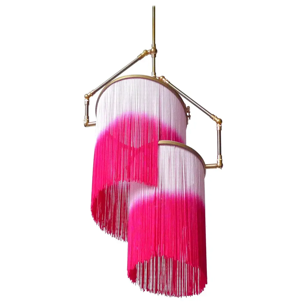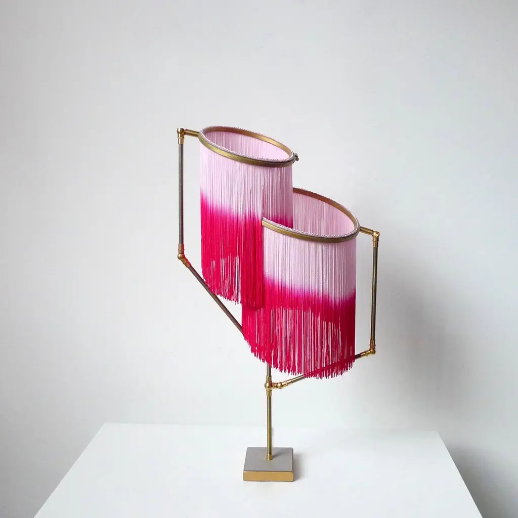 Pink charme table lamp, Sander BottingaDimensions: H 73 x W 38 x D 25 cmHandmade in brass, leather, wood and dip dyed colored Fringes in viscose.The movable arms makes it possible to move the circles with fringes in different positions.So you can change the light object in multiple compositions.The brass lamp base, lamp holder and dimmer are inlaid with leather.Only for Led light bulbs.The design artwork is meticulously handcrafted in a limited series, sometimes in corporation with small artisan workshops.All our lamps can be wired according to each country. If sold to the USA it will be wired for the USA for instance.
