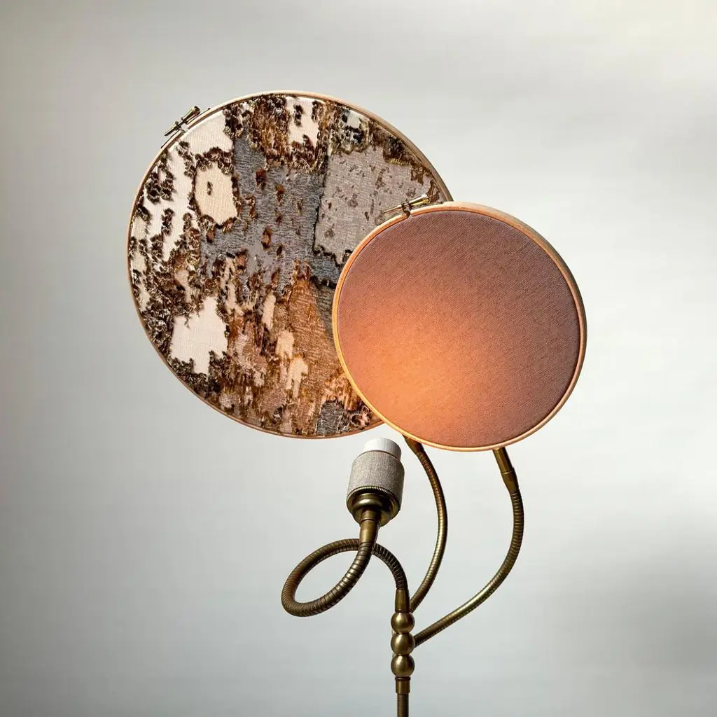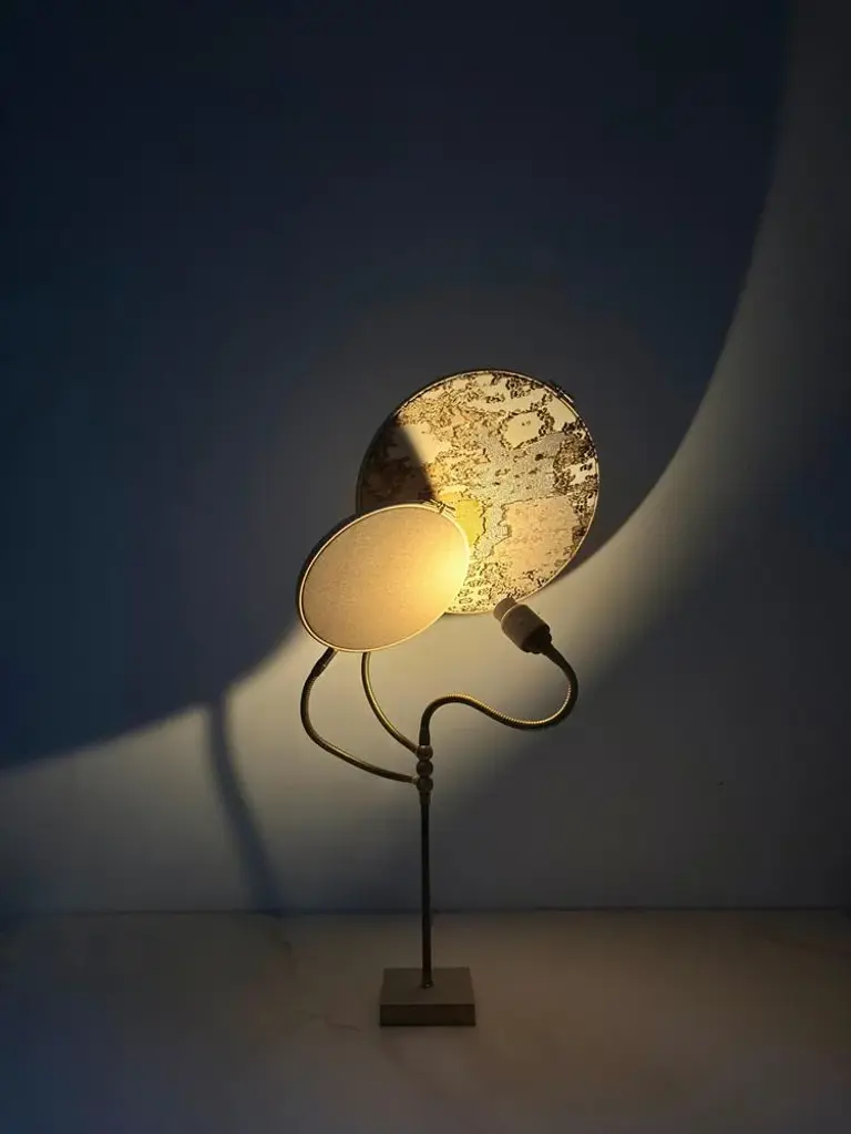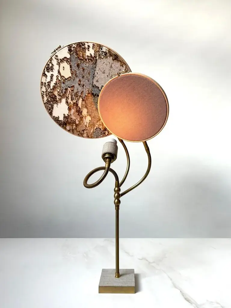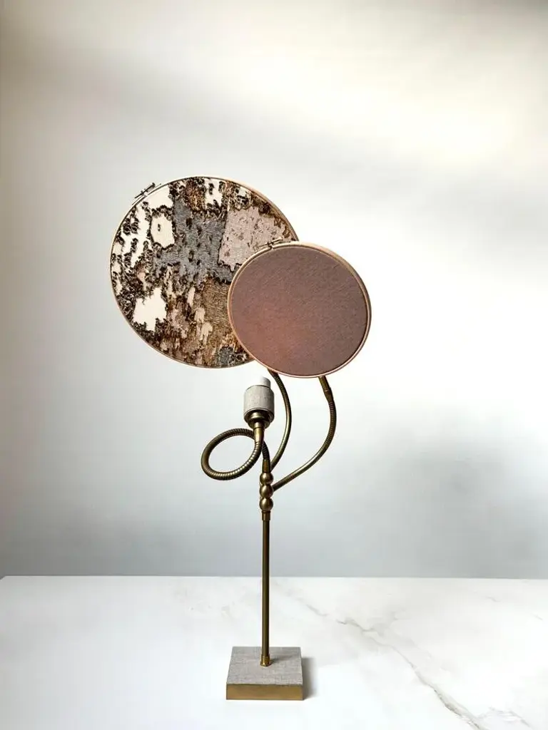 No. 32 table lamp, 2 circles, by sander bottinga dimensions: d 30 cm x w 40 cm x h 140 cm materials: brass, wood, stone color hand-painted linen, marble embroidered design in silk, viscose, cotton, leather. this piece is attributed to the mentioned designer/maker. It has no attribution mark and no official proof of authenticity, however it is well documented in design history. I take full responsibility for any authenticity issues arising from misattribution