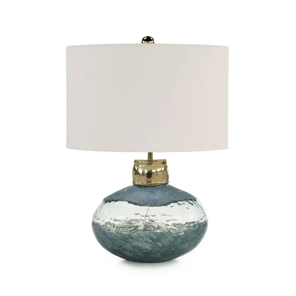 The Noctis Table Lamp is a stunning design statement that commands attention within a space. This art glass piece features a textural, two-toned look that displays a transparent center between solid blue tones. A large, asymmetrical neck accent in a Champagne finish matches the tones of the hardware and ball finial. The look is completed by large white drum shade.