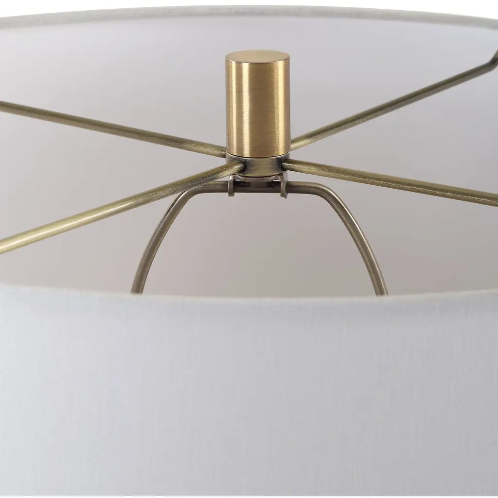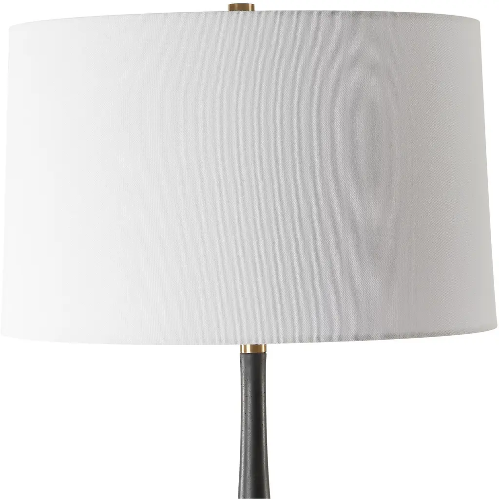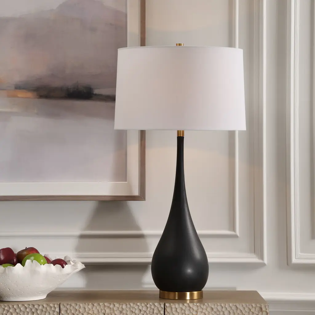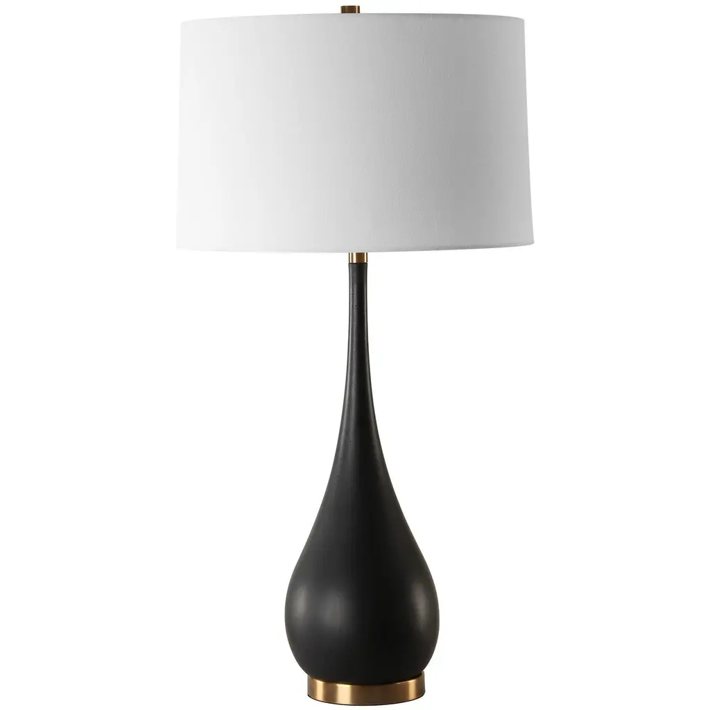 This Exquisite Table Lamp Features A Tear-drop Shaped Base Handcrafted From Sleek, Man-made Black Stone. Accentuated With Brass-plated Details, It Exudes Sophistication And Modern Elegance. The Slightly Tapered Round Hardback Shade Is A Crisp White Linen Fabric.