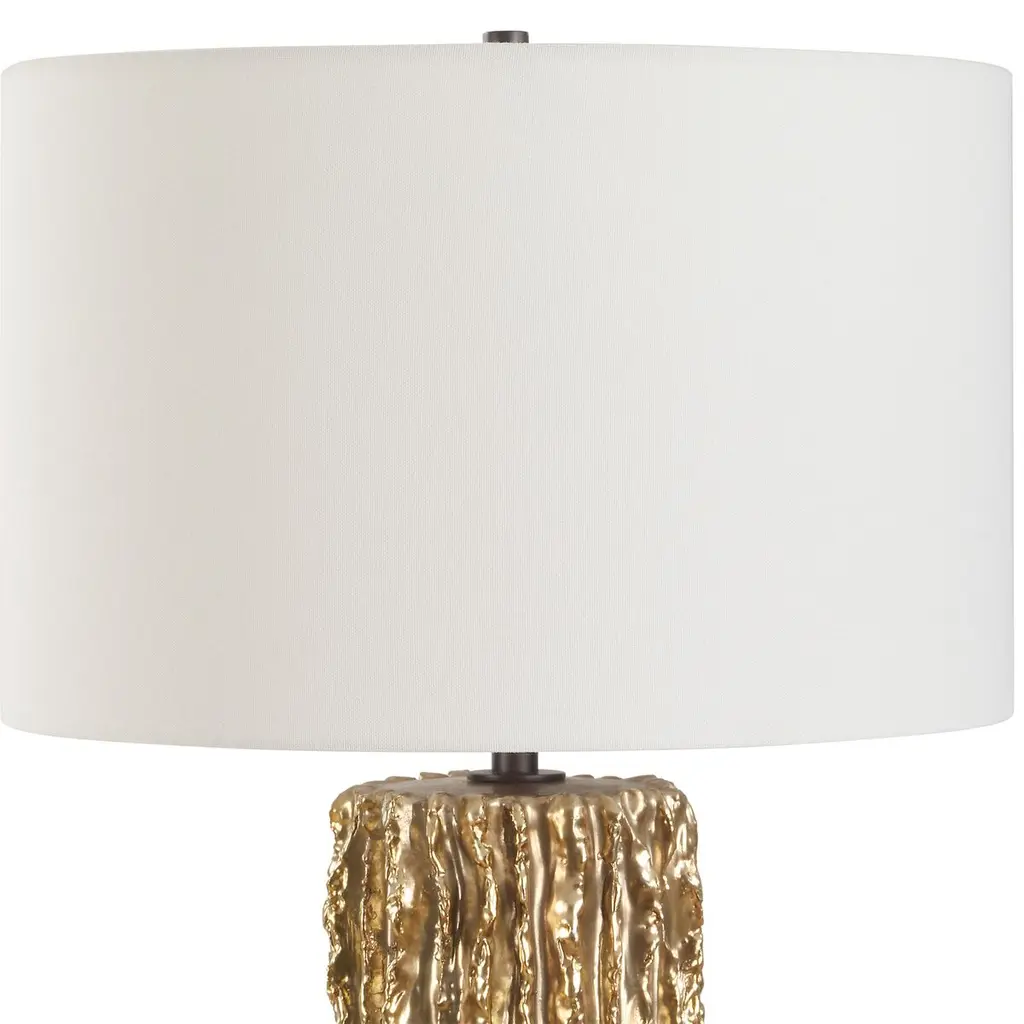 The Noel Table Lamp is a striking piece that exudes elegance and sophistication. Its surface is richly textured with jagged edges and deep channels, creating a captivating visual interest. The lamp is complemented by sleek iron accents, adding a touch of modernity to its design. Topping it off is a round hardback drum shade, enveloped in a casual white linen, which diffuses light beautifully, casting a warm and inviting glow. This lamp is a perfect blend of artistic craftsmanship and functional design, making it an exquisite addition to any space.