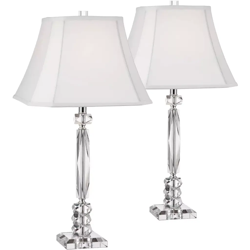 Illuminate your space with the NOLA 16 inch crystal table lamp set. This elegant duo adds a touch of sophistication to any room with its clear and white hues. The crystal material beautifully captures and reflects light, creating a warm and inviting ambiance. Whether placed in a living room or bedroom, these lamps complement various decor styles. Their sleek design and subtle color palette allow them to blend effortlessly with existing furnishings. Transform your interior with the simple addition of this stunning lamp set and enjoy the gentle glow and refined style it brings to your home.