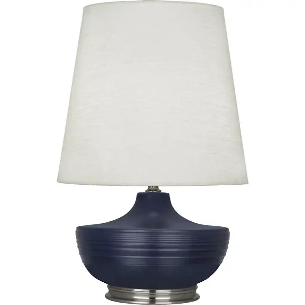 The Nolan Table Lamp by Robert Abbey brings a traditional style inspired by global architecture to surfaces in your home. A crisp tapered drum creates an evenly diffused layer of light as it sits upon a shapely ceramic body. With a vase-like silhouette that sits on a metal base, the smooth surface of this curved form is accented with simple, minimal, and horizontal lines that lend this table lamp a tailored quality.