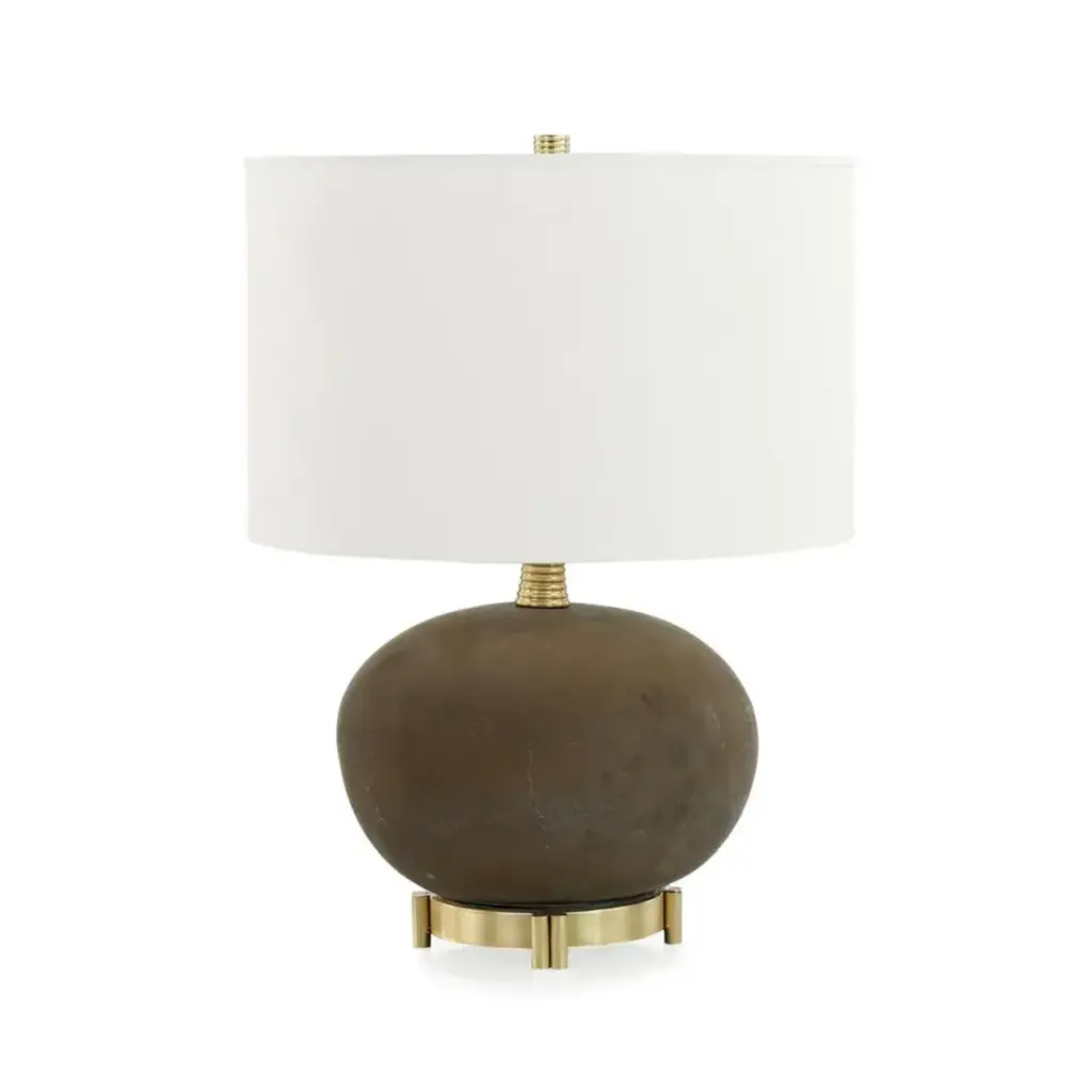 The Nomad Table Lamp is a stunning piece that elevates rich earthen tones with opulent metal accents. Crafted from porcelain with a rich brown tone, the piece features a coiled Brass accent at the matching the finial above. A rounded brass base features four pairs of slender rods, completing the look of this three-way turnkey lamp.