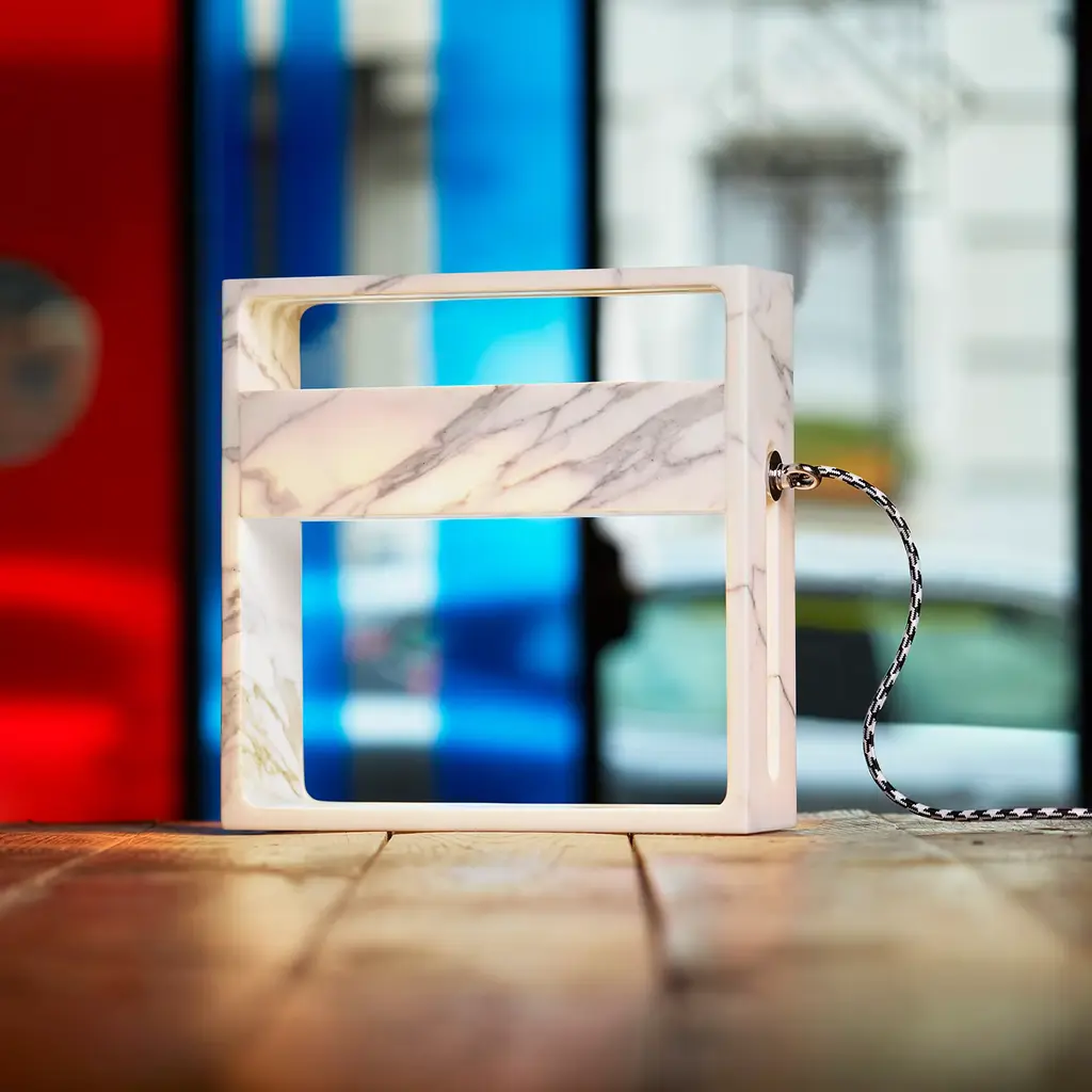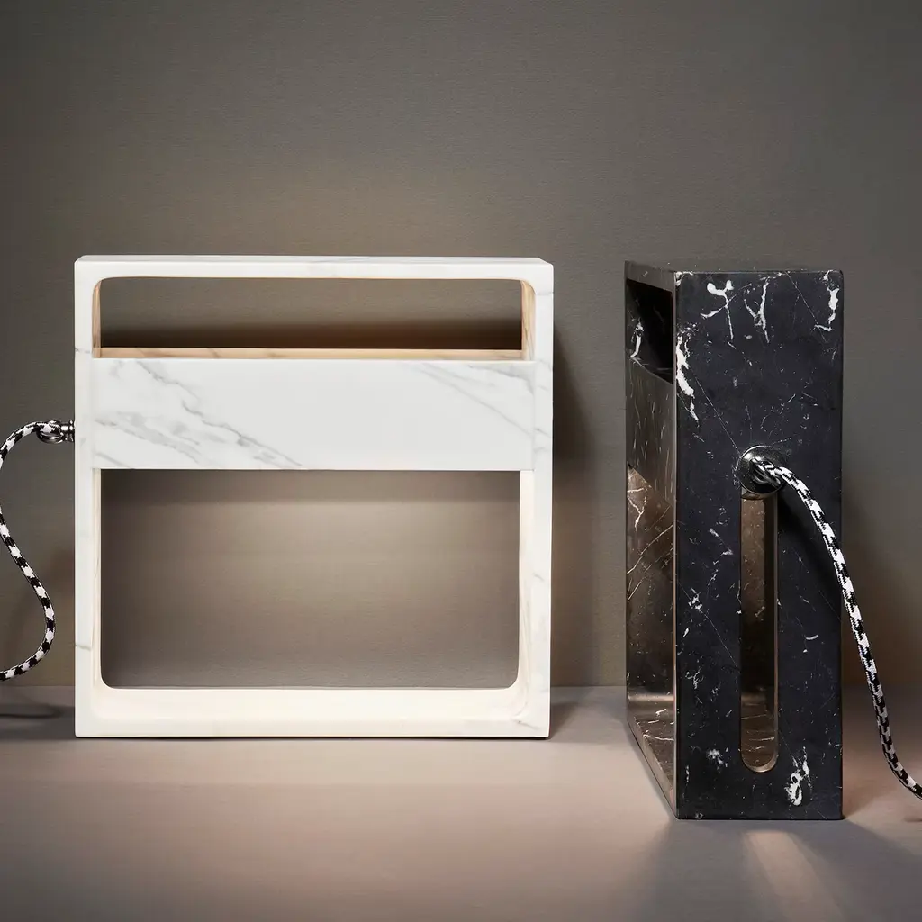 Stunning in its simplicty, this superb table lamp made of Carrara marble is inspired by Gio Ponti's Quadri di Luce. Featuring a compact, minimalist form, it is entirely handcrafted from marble. Boasting two lampshades within its modular structure and warm led lights, this objet d'art belongs to a numbered and certified limited edition. Available in various types of marble, please contact the Concierge for further information.