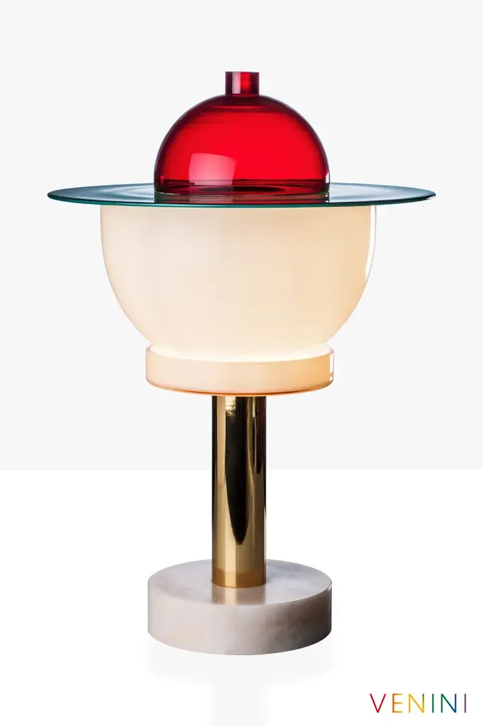 Nopuram is a table lamp made of mixed technique blown glass and marble base. Indian dancers sinuously swaying, their noopuram bracelets tinkling at every move. Gold combined with red and white fabrics whose meanings go beyond matter. This work by Ettore Sottsass contains fragments of India. Nopuram is available in a numbered edition table lamp version.“When we imagine glass objects, we feel very special emotions: we imagine light and colours that we cannot touch. Then, suddenly, there is light and there are colours, yet we still cannot touch them. They remain weightless, without temperature, living only in our imagination. All this produces very special emotions.” (Ettore Sottsass)Colors:Rosé / Green / RedLight source:1 X max 12W LED E27 - DimmerableNumbered Edition