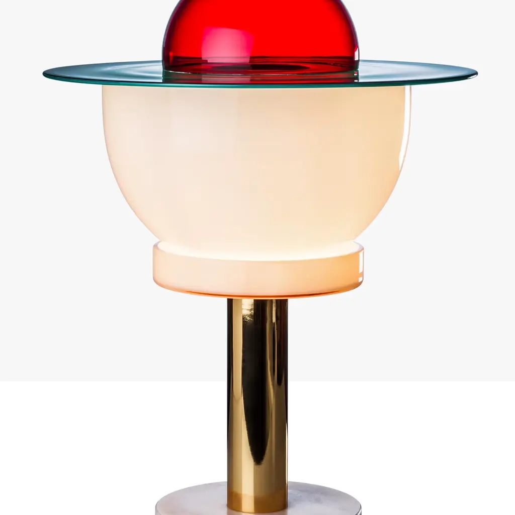This table lamp designed by Ettore Sottsass is a functional sculpture with an abstract drum composed of two half spheres - one small in red and one large in white - intersected by a flat circular panel in green. A cylindrical white marble base and golden column provide visual continuity and stability to the piece. Part of a numbered collection numbered by year, this lamp holds one E27 max 10W LED bulb.