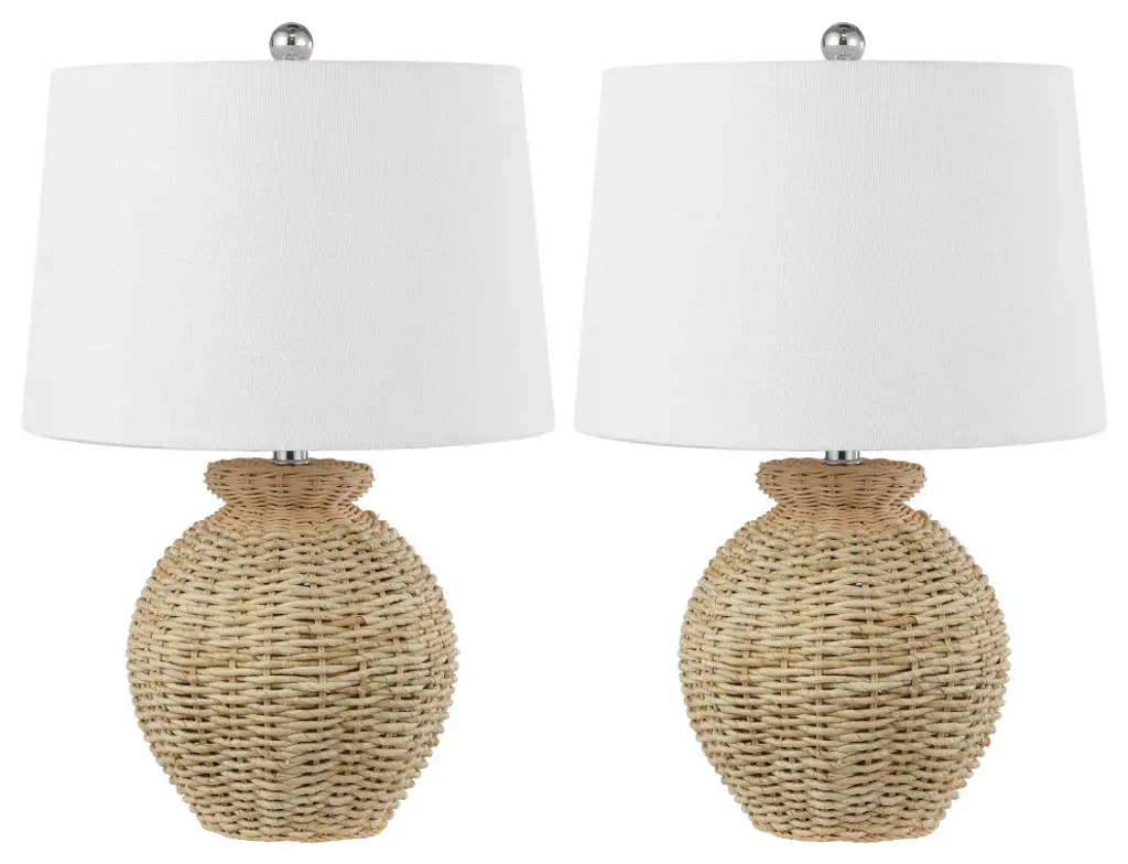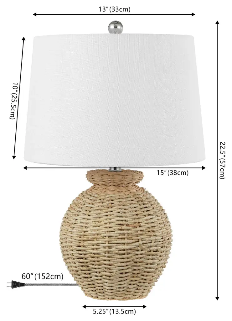 Our versatile wicker table lamps are inspired by coastal cottages and rustic interiors. These vintage-inspired lamps feature a woven wicker base and linen shade. You''ll love their classic look in a bedroom, living room, or office.-The natural wicker base and soft white lampshade are accented by a nickel silver finial-Quality touches include a rotary switch and hardback linen shade-Add a casual, rustic touch to any space with the natural textures of this classic lamp design-Eco-friendly 9W LED bulb included-Takes 1 bulb and compatible with TYPE "A" 100W or CFL 23W or LED 13W-Color Temperature: 2700K-CRI: 80-Color: Brown with White Shade-Body Material: Rattan--Finial Material: Plastic-Finial Color: Chrome-Harp Color: Silver-Includes: Two (2) lamps-Assembly Required-Lamp: 22.5 inches high x 15 inches wide x 15 inches deep-Shade: 10 inches high x 15 inches wide x 15 inches deepYou see a lamp.We see a decorative work of art.A perfectly curved shade casts a dramatic shadow on a floor. A silk cord you never want to hide. Compatible with LED lightbulbs: as easy on the environment as they are on the eyes. The JONATHAN Y Lighting collection considers every detail from impeccably sourced materials to designer styling. And our prices are so attractive, we''ve transformed a functional necessity into a fashion accessory.JONATHAN Y Lighting - a fashion revolution in home decor.
