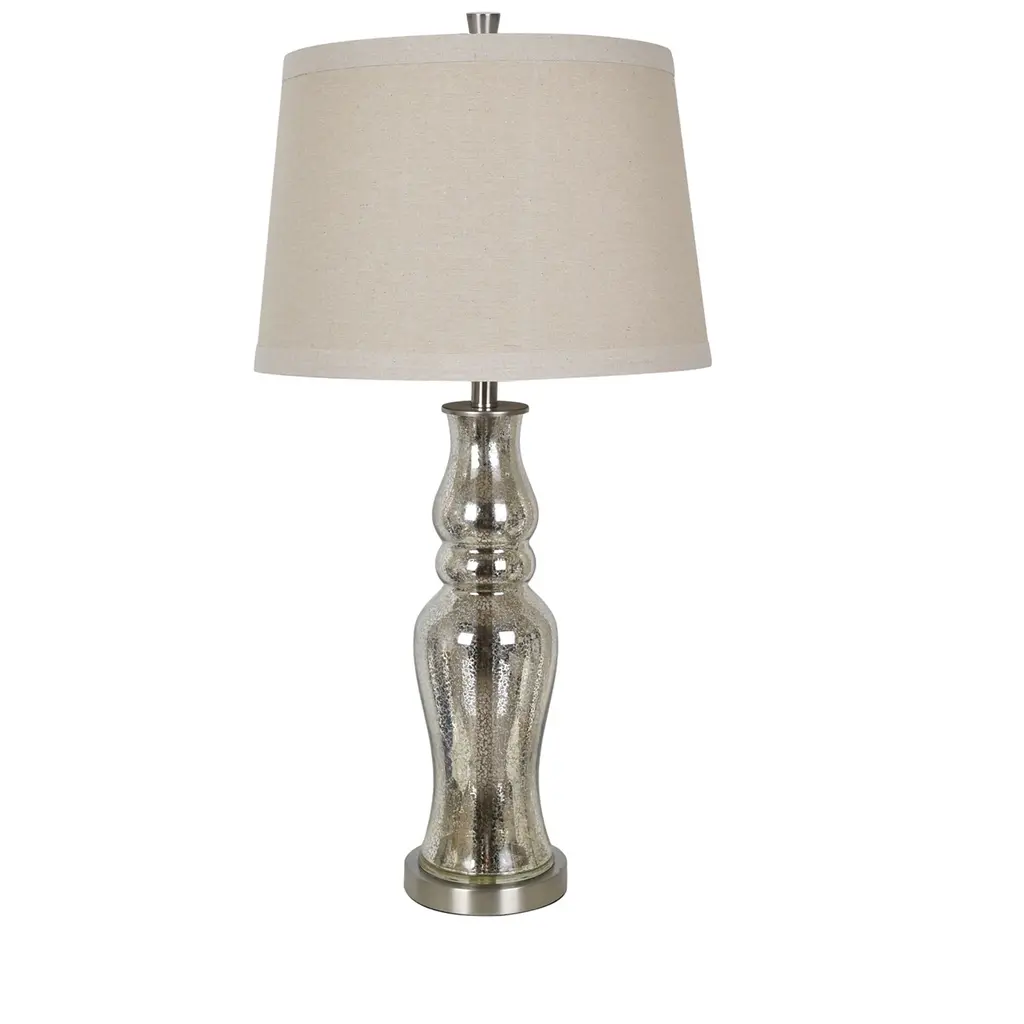 Antique brass accents enhance the beauty of this mercury glass lamp. The graceful curves of the frame''s traditional silhouette glow in the light diffused by the white hardback fabric shade. A lovely accent for a side table in a hallway or living room, this antique brass mercury glass lamp is also an elegant choice for a dining room buffet, office desk, or bedroom nightstand.Features: Finish: Mercury With Antique BrassShade Finish: WhiteMaterial: Glass , Metal Shade Material: Hardback FabricLength: 16.5 inchesWidth: 16.5 inchesHeight: 33 inchesVoltage: 120VWattage: 150Safety Rating: Dry Location - This item is rated for dry locations, meaning it can be used in an indoor area that is not normally subject to dampness. May include a location subject to temporary dampness provided ventilation is adequate to prevent any accumulation of moisture such as the bathroomBulb(s) Included: NoBulb Type: IncandescentNumber of Bulbs: 1Due to lighting and monitor differences, actual colors and finishes may vary slightly from what appears online.