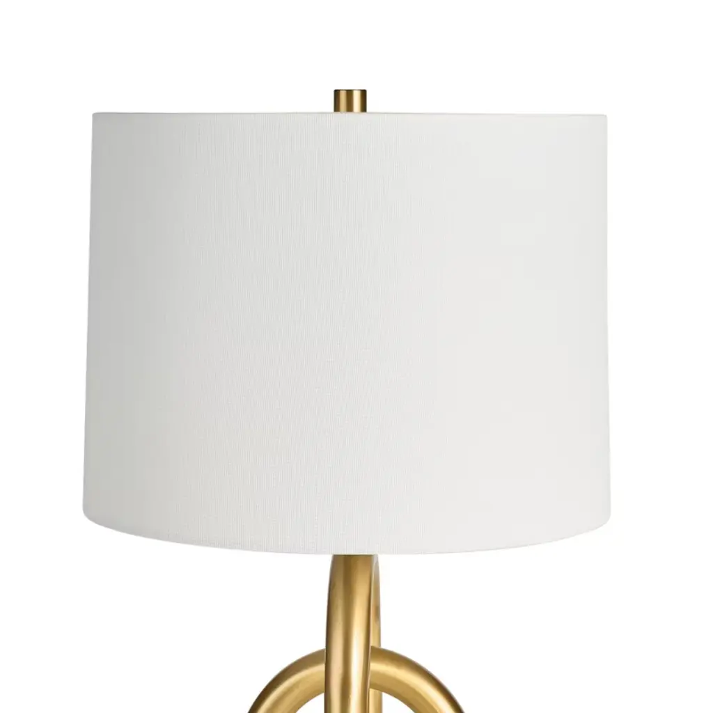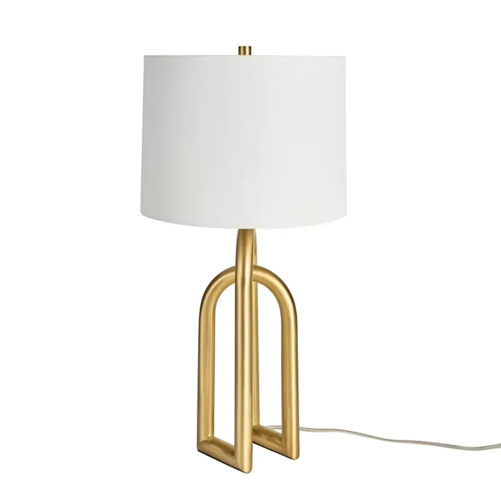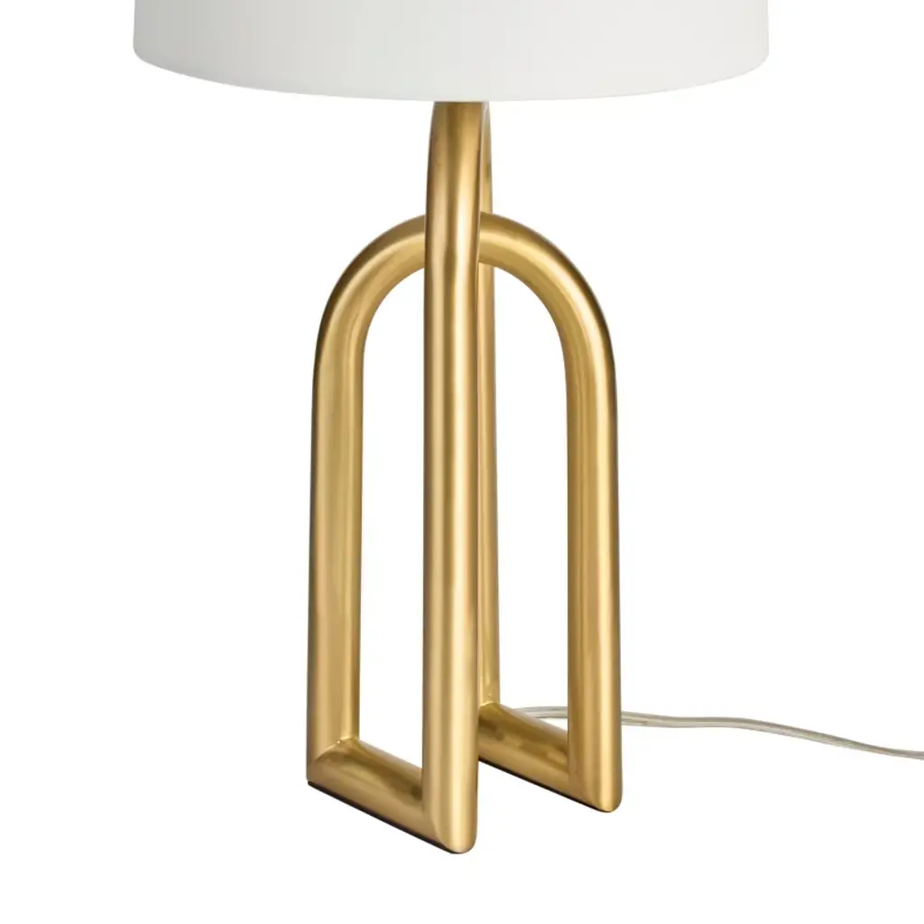 This table lamp blends modern sophistication with a touch of glam. Featuring a sculptural arched base in a brushed gold finish, it brings subtle shine and style to any setting. Paired with a crisp white linen drum shade, this 23-inch lamp suits nightstands, consoles, or accent tables throughout the home.