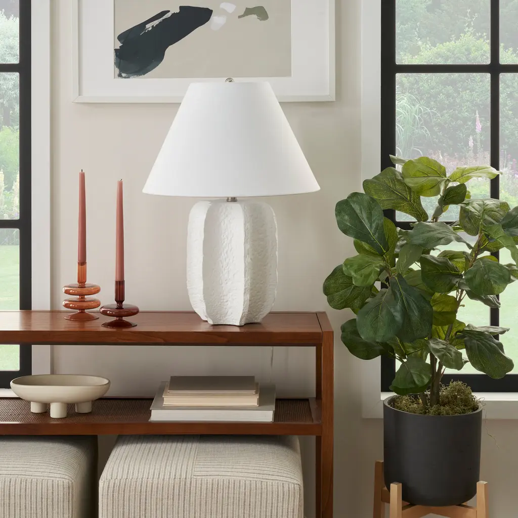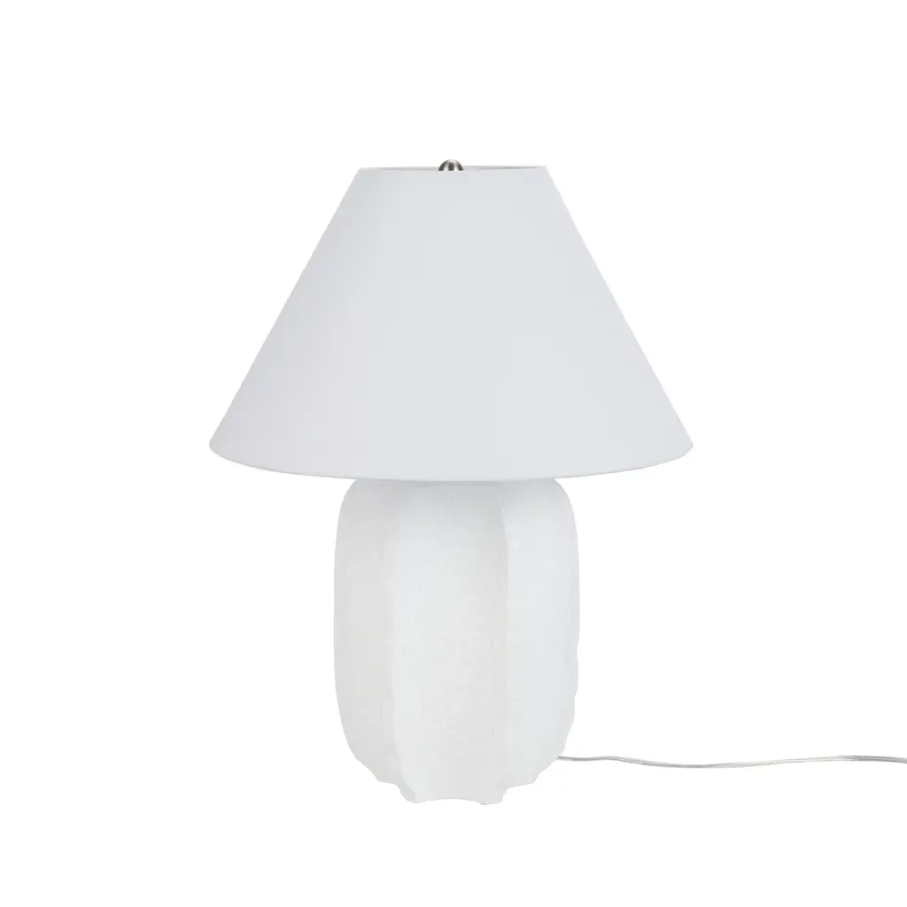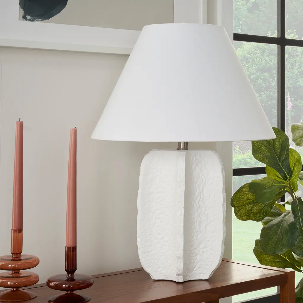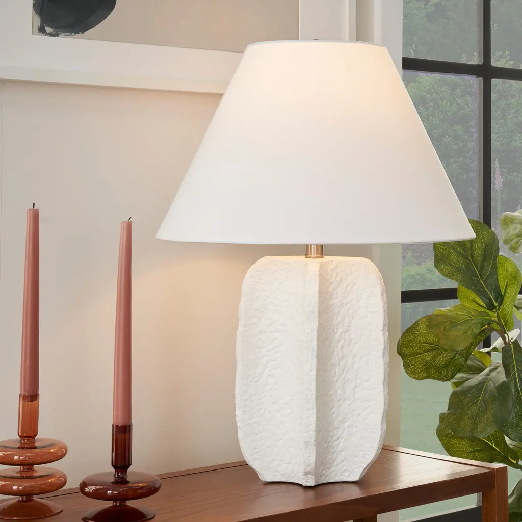 Exuding an air of refined simplicity, this modern table lamp showcases a beautifully textured ceramic base, reminiscent of fine plasterwork. Its crisp white finish embodies understated elegance, effortlessly elevating any decor. Topped with a tapered white shade, the lamp luminates, making it an ideal accent piece for contemporary interiors. Features: