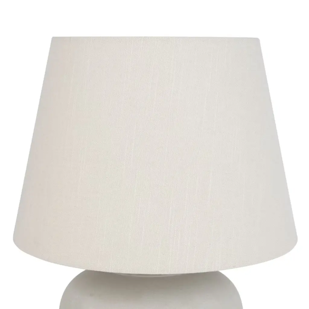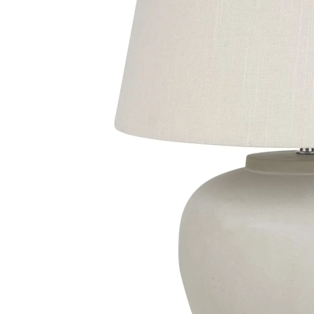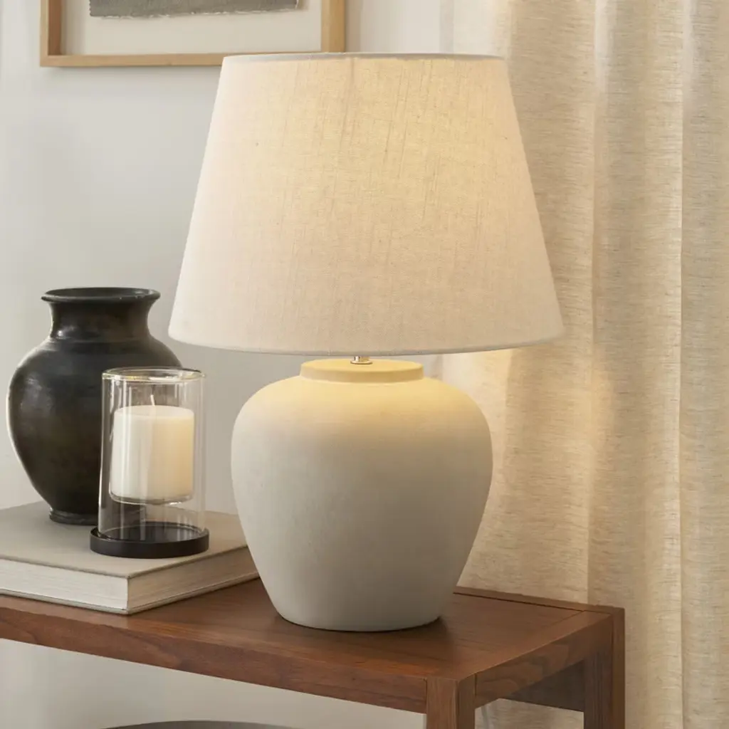 A seamless blend of contemporary design with vintage appeal. Its rounded ceramic base, boasting a soft rustic finish, is complemented by a natural shade that diffuses soft warm glow. Whether styling a minimalist bedroom or a chic living room, this lamp is sure to enhance any setting with its timeless appeal.