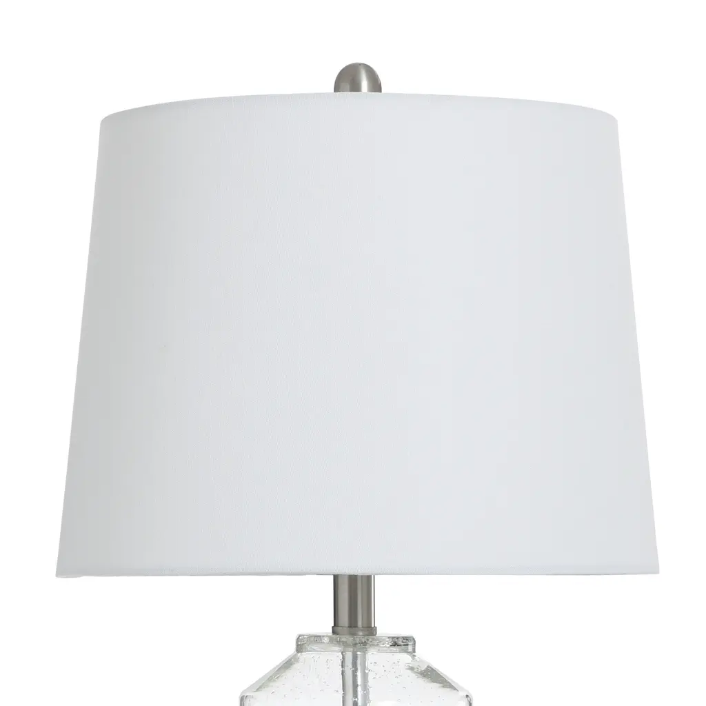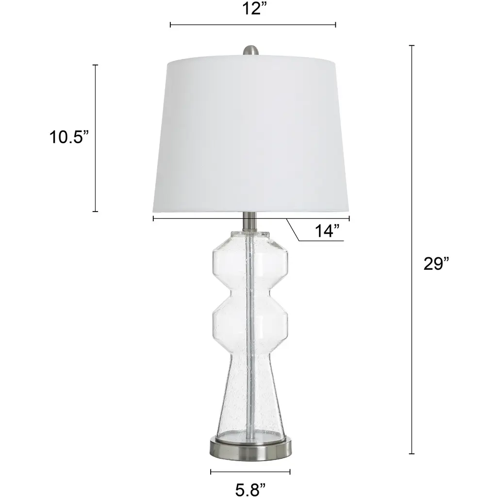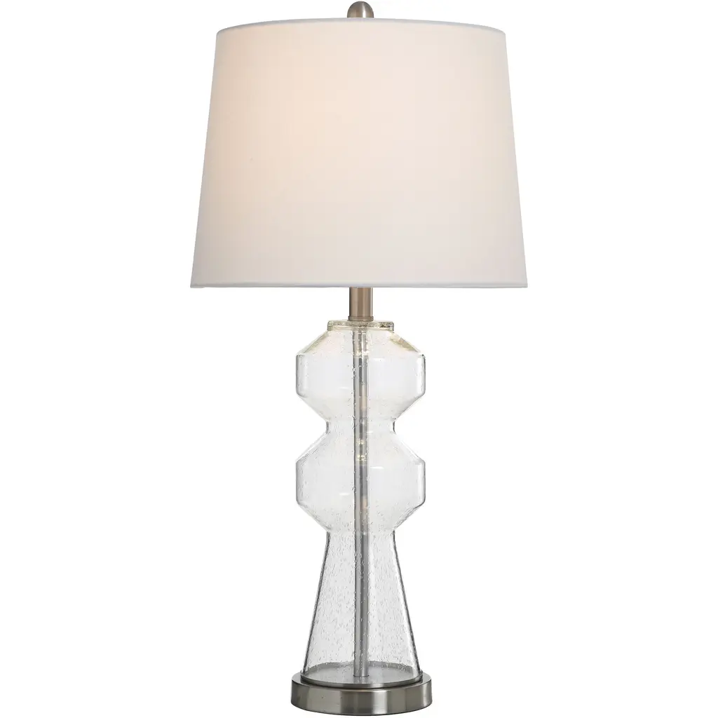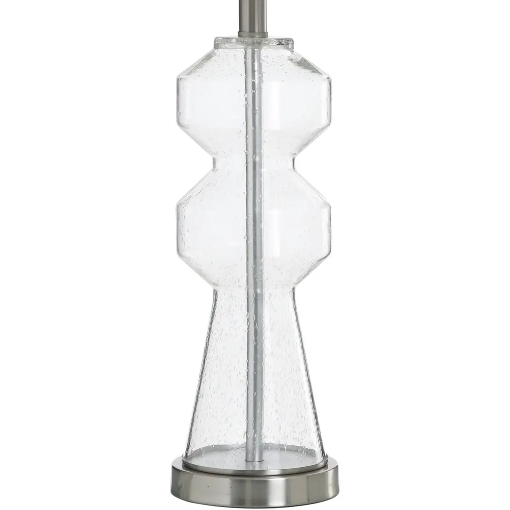 The Nova table lamp has a clear seeded glass body that makes a stunning focal point in any bedroom, living room or hallway in need of a little flair. The stacked spheres add a touch of femininity and softness to the bold brushed steel base. The curved lines of this lamp's body creates dynamic eyelines in the home. The hardback shade emits a soft, ambient light.