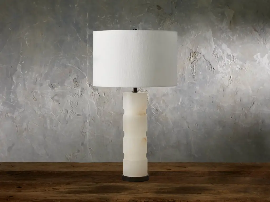 Carved from solid alabaster blocks, this stately stone table lamp elevates décor with stunningly crafted style. Complemented by a bronze-plated steel base and linen shade, this fashionable fixture is the perfect finishing touch for any space in your home.