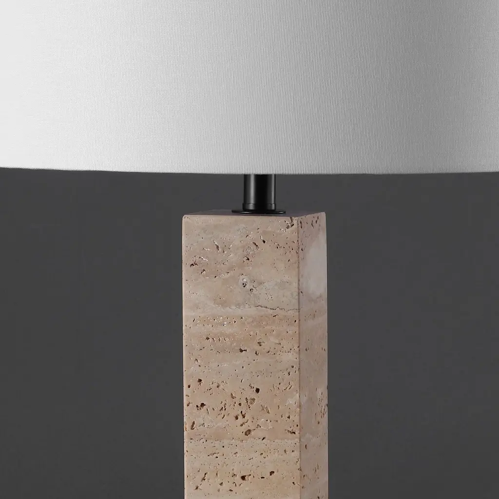 Add interest and a refined touch of luxury to your home with our stately table lamp. Bringing effortless poise to any corner, our crisp and modern table lamp celebrates the organic beauty of travertine. Its rectangular base and pedestal beautifully highlight the creamy, earthy tones and weathered distress marks of the material. Finished off with a white linen drum shade, our table lamp attains a graceful tone and neutral coloring that elevates a variety of styles and decor. It includes a dimmer to offer a pleasant glow to your nightstand, console, or end table.
