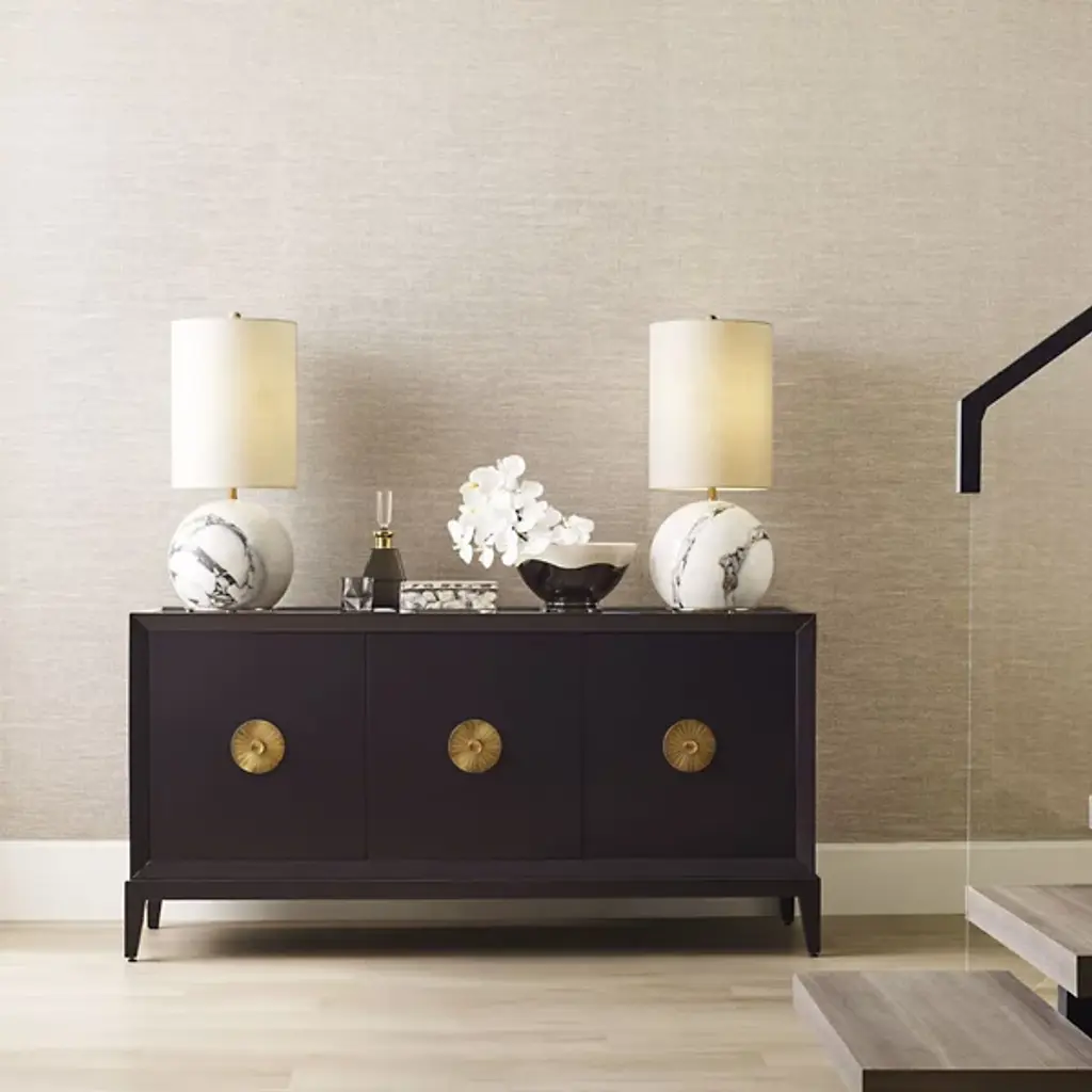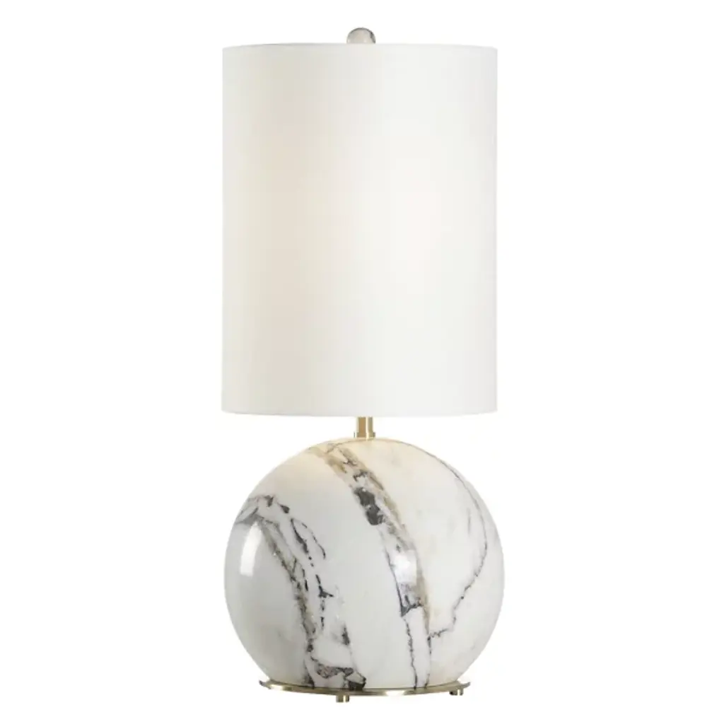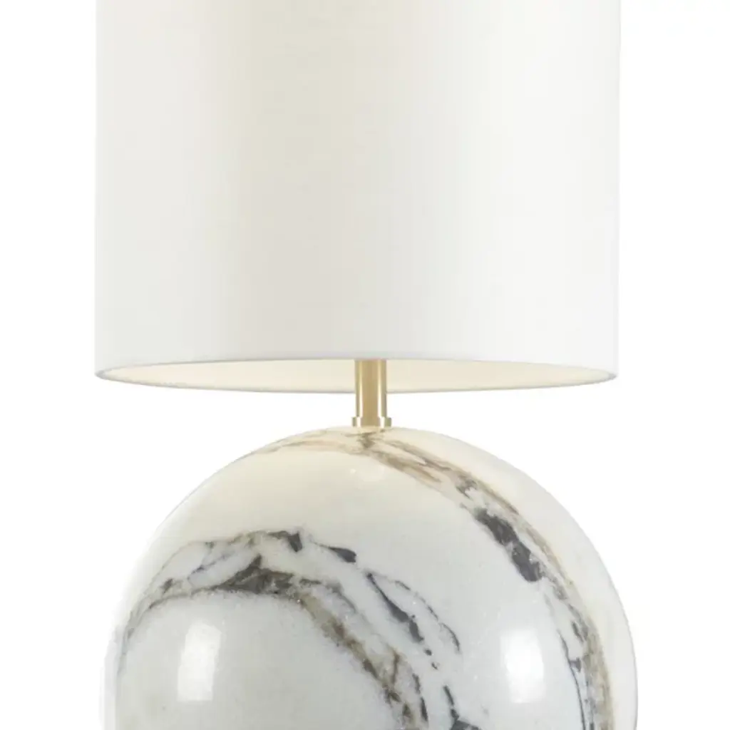 The Novara Table Lamp from Wildwood turns natural stone into functional art with its spherical marble body. Every lamp features unique veining patterns that make each piece one-of-a-kind. The tasteful metal accents serve a dual purpose-they provide the necessary structure while adding definition to the lamp's profile. Topped with a linen drum shade in perfect proportion to the base, this piece creates a harmonious balance from top to bottom. Consider buying these lamps in pairs-they look particularly striking, flanking larger pieces like buffets or sideboards.